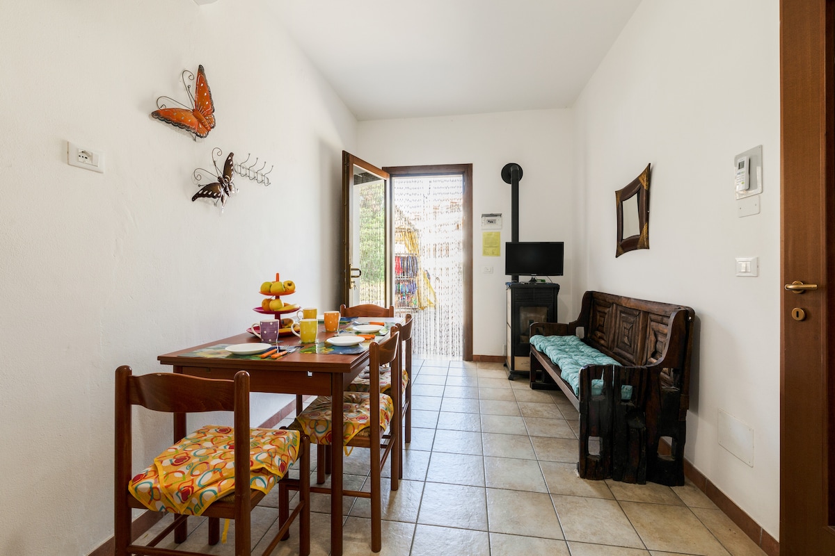 Apartment on the ground floor composed of living room with kitchen and sofa, large terrace with pergola, bathroom with shower box, double bedroom with space for baby cot 0-2 years, bedroom with two single beds or one double bed.