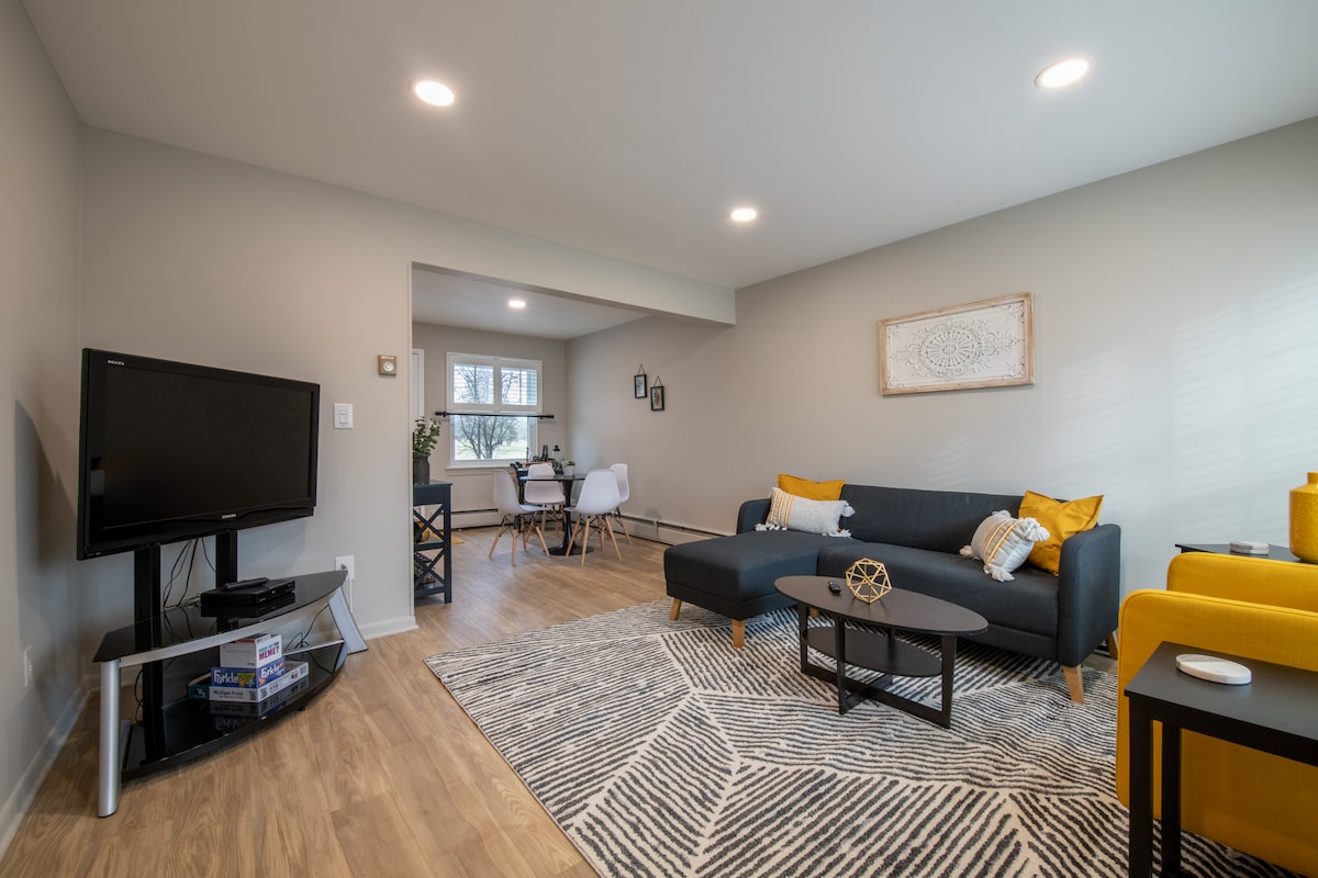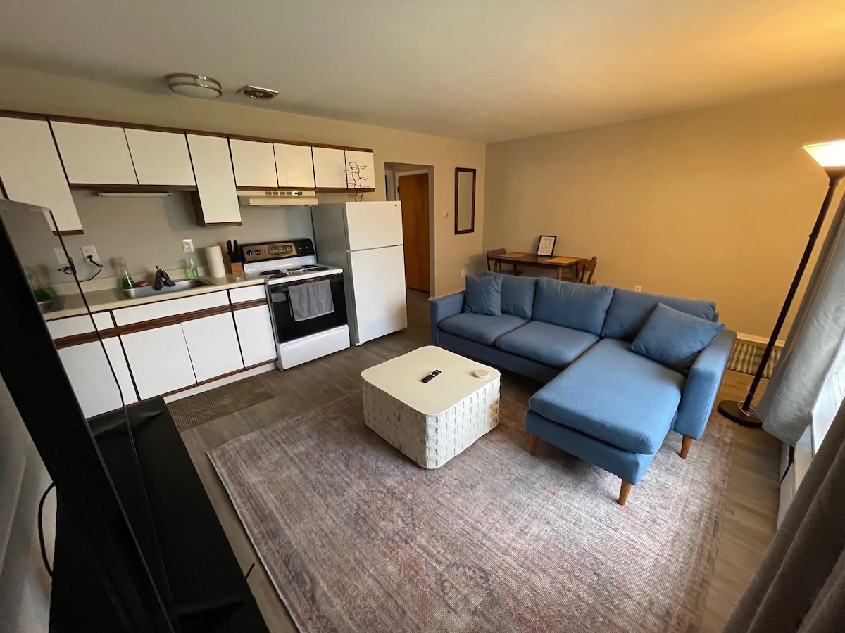 This charming apartment features a bright living room with a smart TV, a fully stocked kitchen with modern appliances, and a cozy queen-sized bed for restful nights. The bathroom is spotless and includes all the essentials. Enjoy a private entrance, shared laundry access, and free on-site parking. The space is thoughtfully designed for comfort and convenience, ideal for both short and extended stays.