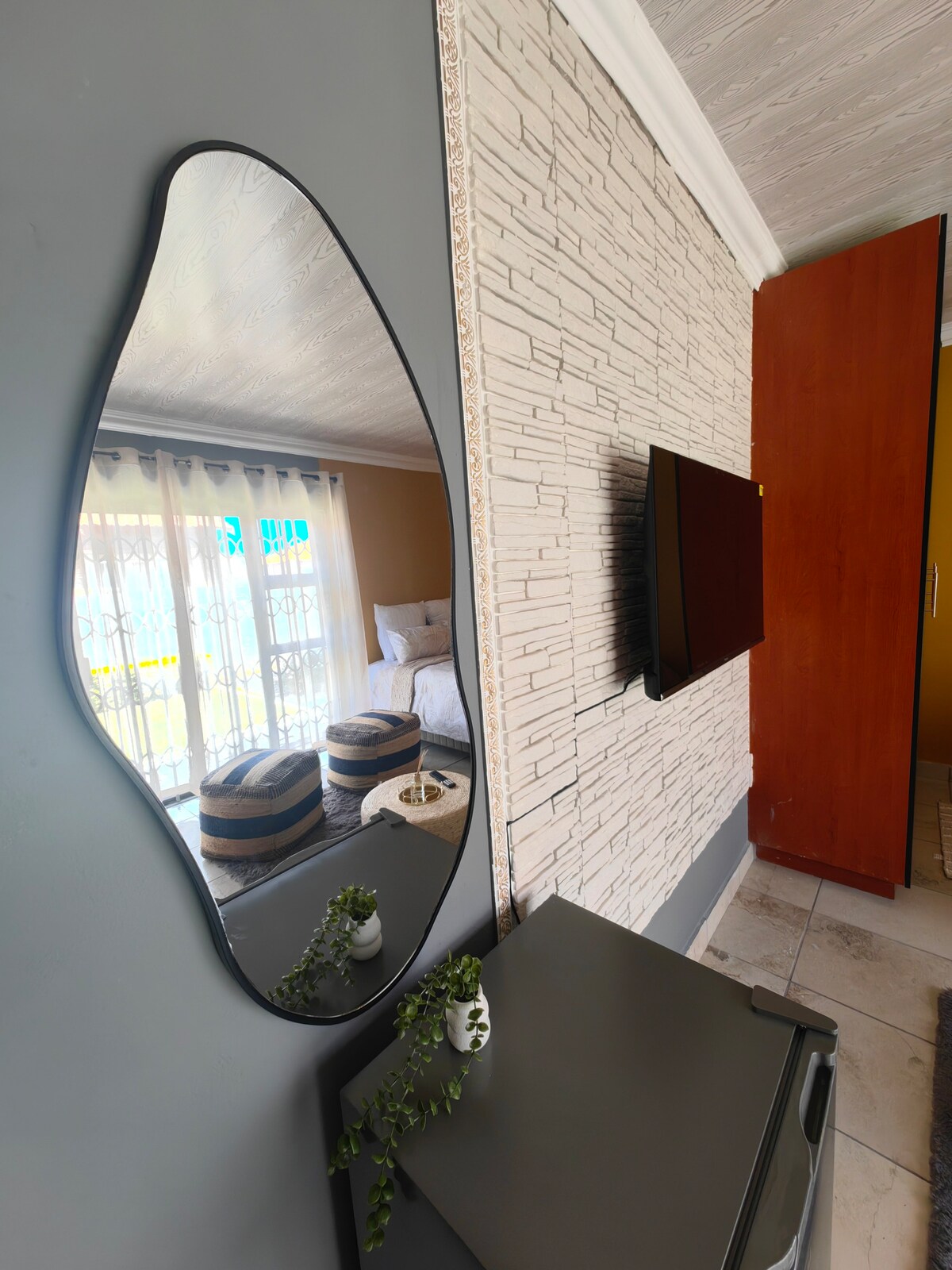 Experience the best of Rustenburg in our charming apartment retreat, perfectly suited for a relaxing getaway. This entire house apartment boasts a private entrance, ideal for those seeking seclusion. The spacious living room is perfect for unwinding, equipped with a comfortable sofa and a TV for your entertainment. The fully-equipped kitchen features an electric kettle, electric oven, electric stove, freezer, and fridge, ensuring you can whip up delicious meals. Enjoy al fresco dining on the balcony, complete with outdoor furniture and a BBQ grill. After a day of exploring, park your vehicle in our secure, covered parking area. For added peace of mind, our outdoor lighting, and a police emergency contact. Start your day with a refreshing hot shower and iron your clothes with our iron and ironing board. We provide free towels, ensuring you have everything you need for a comfortable stay. Located in the heart of Rustenburg next to waterfall mall this apartment is just a short drive from top attractions, including the Magaliesberg Mountains and the Rustenburg Game Reserve,Sun City,Rustenburg golf club,Impala rugby club.