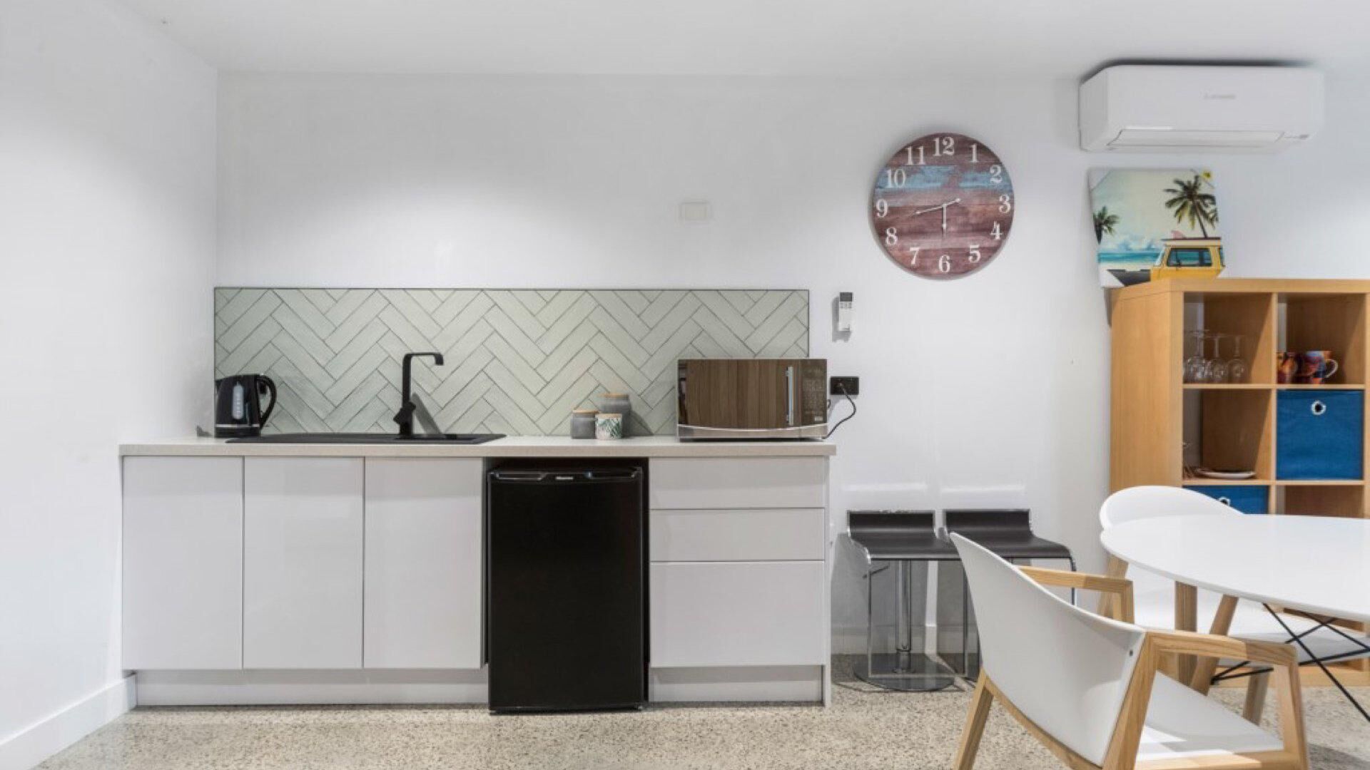 The unit features polished concrete floors, adding a modern and stylish touch, while soft furnishings and thoughtful details create a relaxed, beachy vibe.