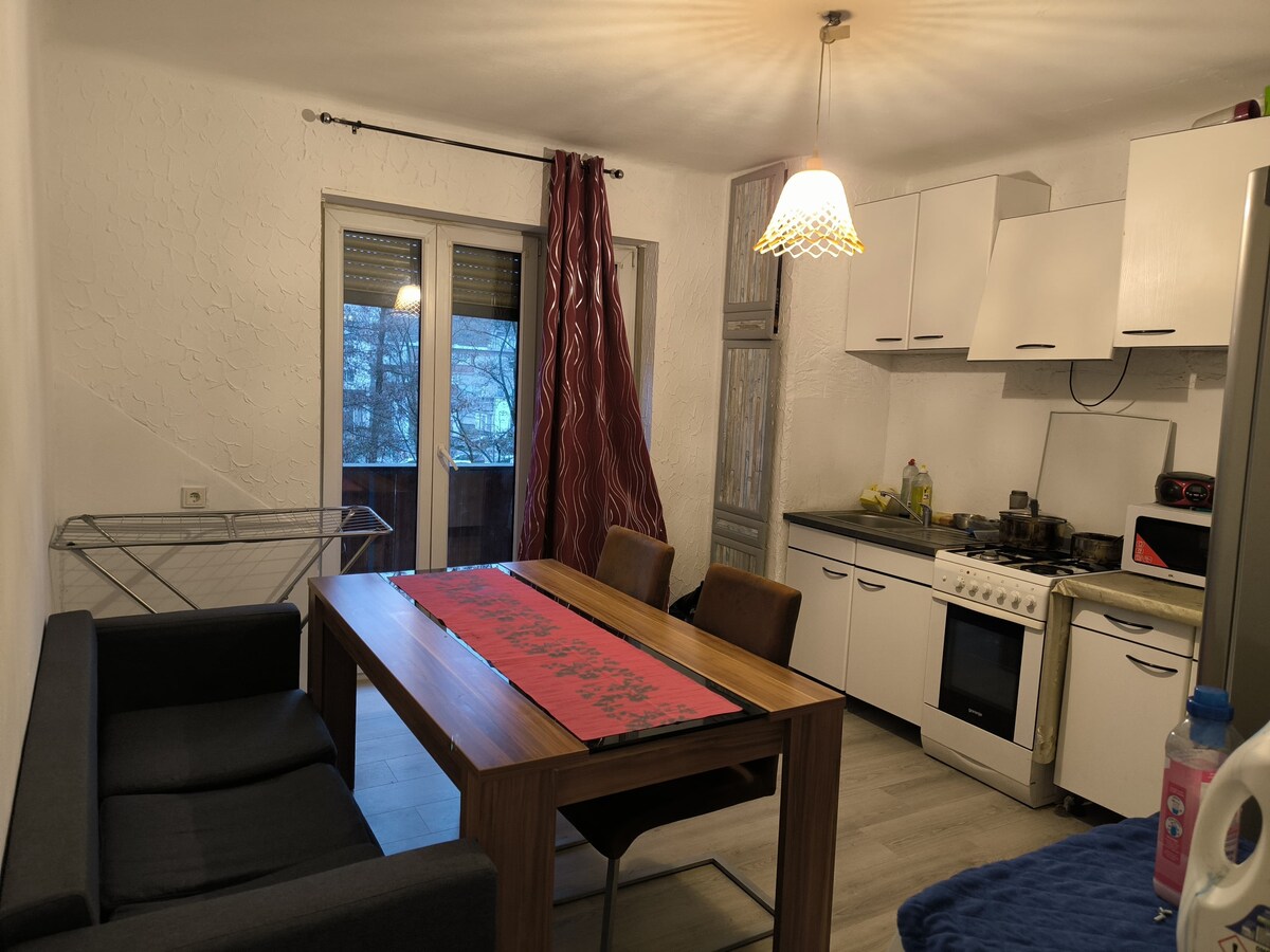 The room is furnished and about 20square meters. The kitchen and bathroom are shared, but are usually free. The location is perfect. Saarbasar, the biggest market, is 300m away. Bus stop and train station are 200m and 250m away respectively. You will enjoy living here😊.