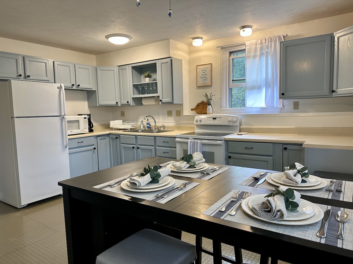 Kitchen includes a new stove, refrigerator, double stainless sink with pull down sprayer faucet, stack-able washer dryer, microwave and counter tops. Kitchen is fully stocked with pots, pans, dishware, glassware and all your cooking needs.
