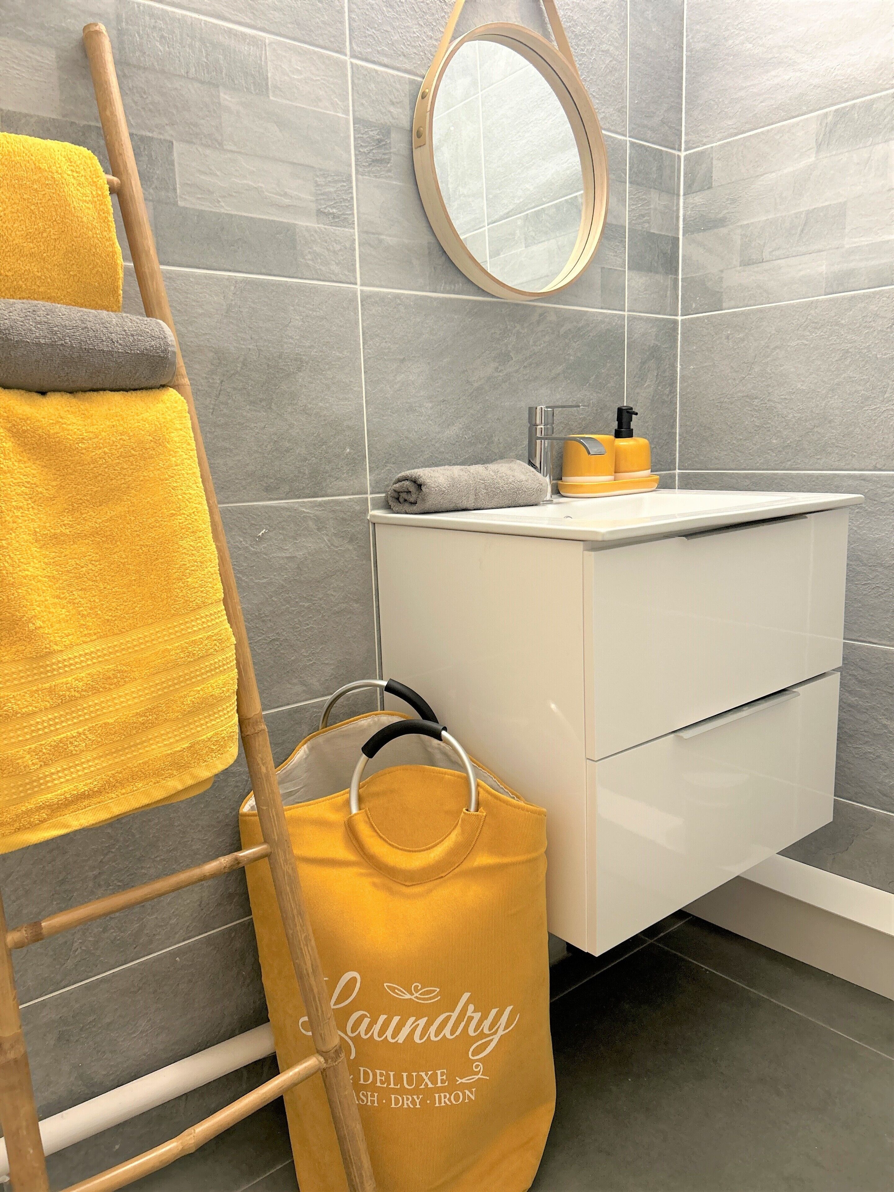 ✅ A functional bathroom with shower, basin, hair dryer and washing machine.