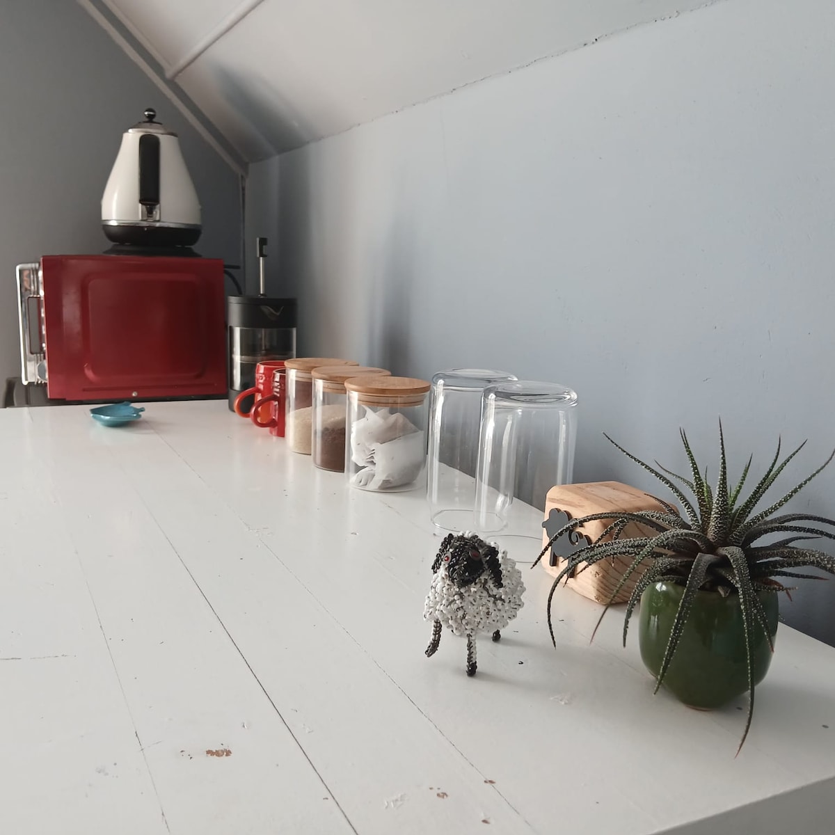 The stylish kitchenette includes kettle, microwave, toaster, and bar fridge.