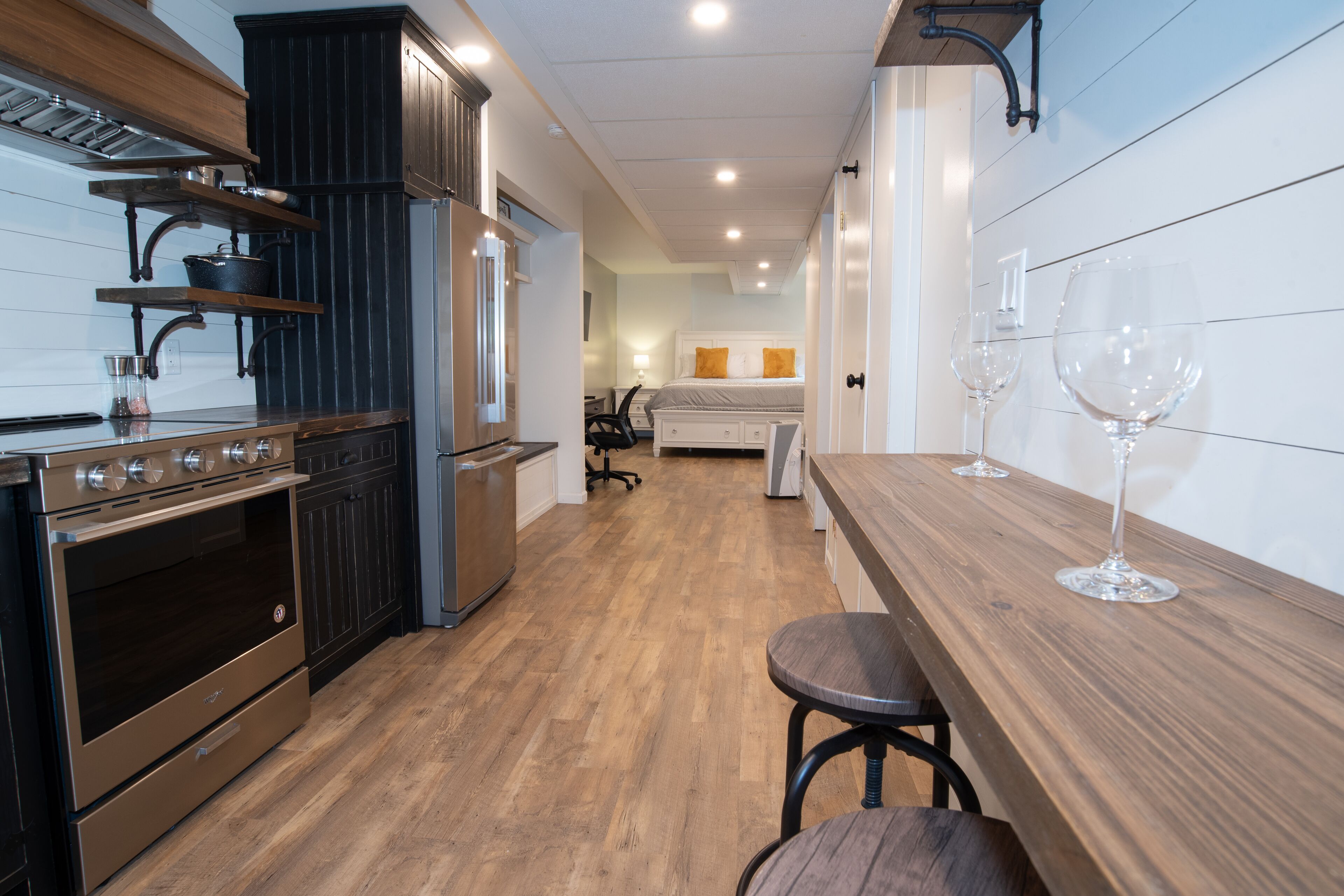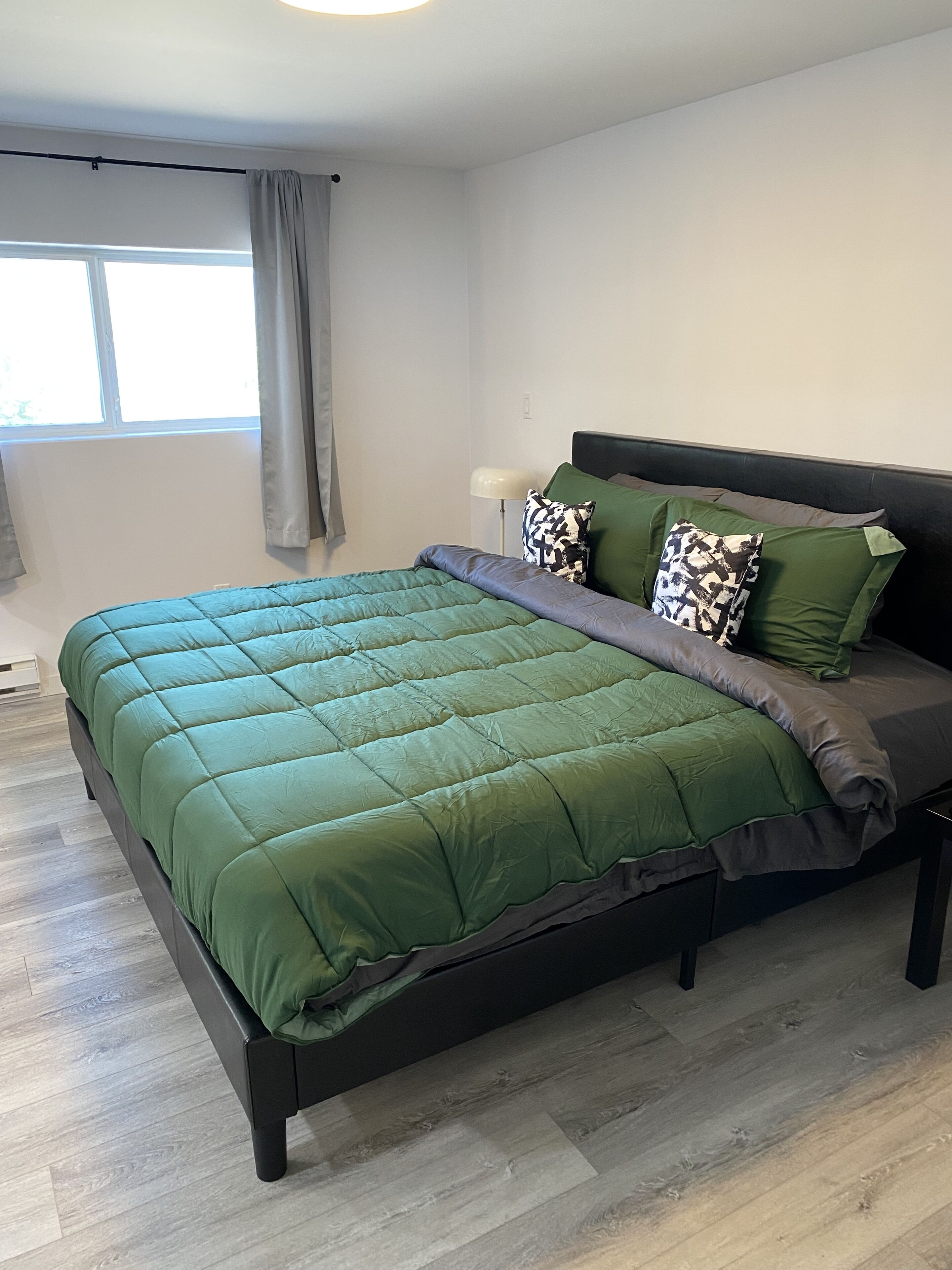 Newly renovated, this semi-lakefront hsuite features a king bed, washer & dryer, 3 piece bathroom and a full kitchen. Wake up to a lake view with a private beach just steps from your door where you can swim & relax!
