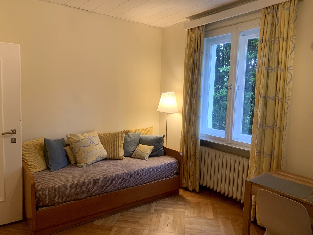 For rent is this lovely furnished room/Studio with private kitchen, bathroom/toilet and balcony with nice views. The entree is shared (with owner). Parking in front of the house. Located near the center of Salzburg in a quiet neighbourhood close to SALK hospitals LKH and CDK, convenient public transport (busses Nr. 1, 12, 28) and infrastructure (supermarket, pharmacy) nearby. Short-term rental for workers, students, etc. No Tourists. Only non-Smoker, no pets, excl. cleaning.