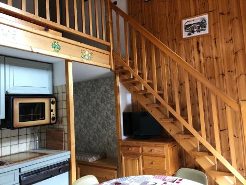 - A living room with equipped kitchen area (14,86m², 1 window and 1 French door facing South-West, mountain view parking and residence) - 2-burner ceramic hob, fridge with freezer (133L), microwave, Nespresso coffee machine, toaster, kettle, wardrobe retractable bed in 140.