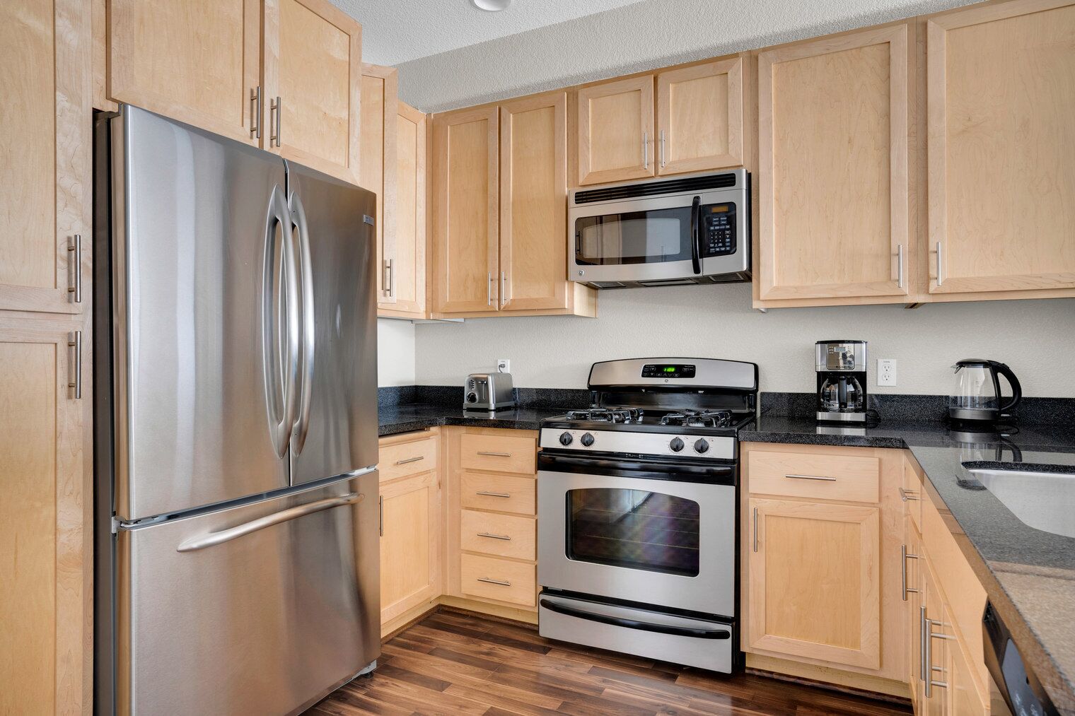 We offer a full kitchen with gas stove, fridge, microwave, cookware, and basics. You will also have an in-unit washer and dryer and a bathroom with a walk-in shower.