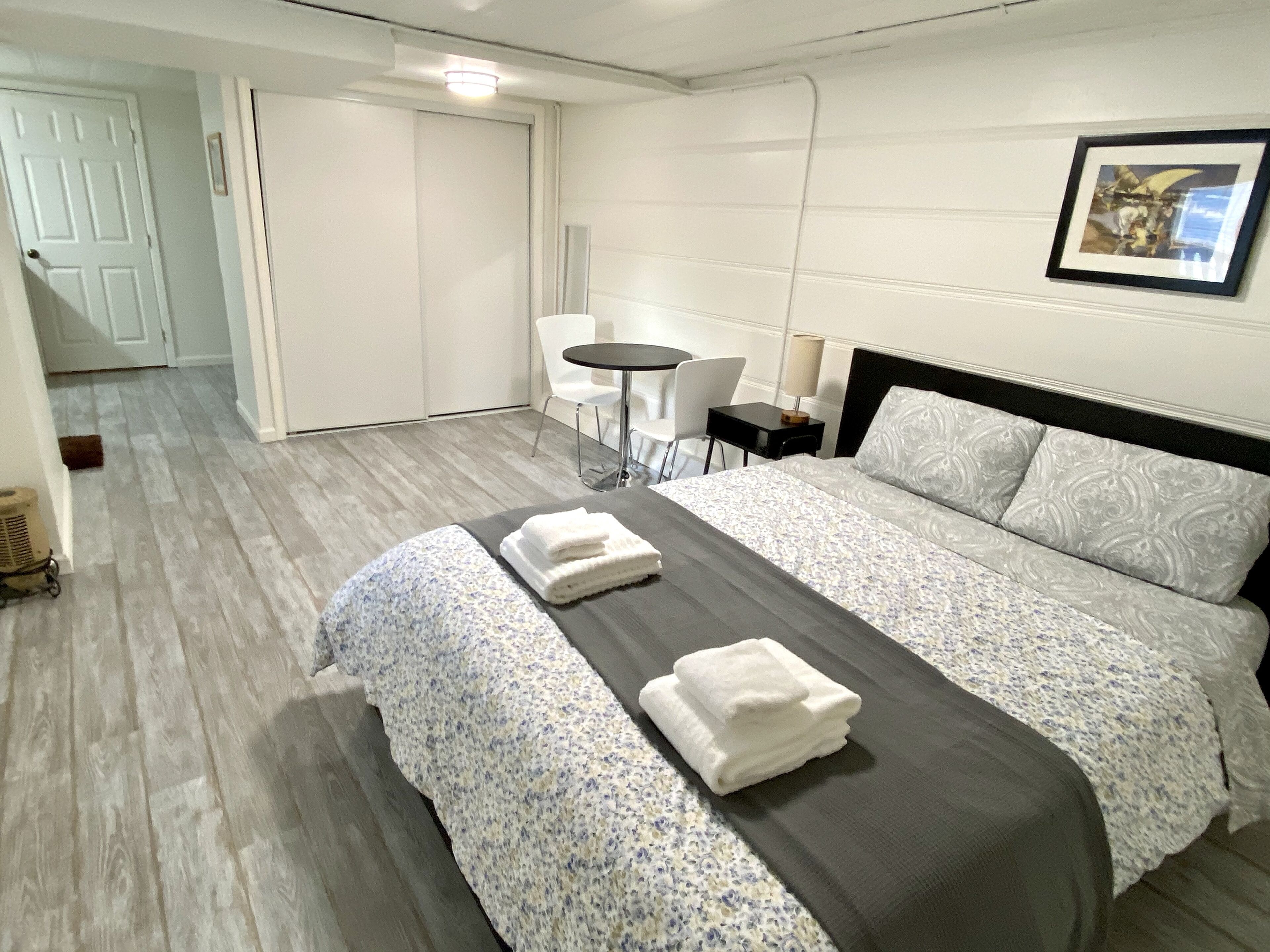 Modern guest studio above a detached garage, fully remodeled in June 2023 and set up for longer stays, work travel, or Bay Area relocation. The ~320 sq ft second-floor space includes a comfortable queen bed, a dedicated work desk, fast Wi-Fi, a smart TV, split A/C and heat, and double-pane windows for comfort.