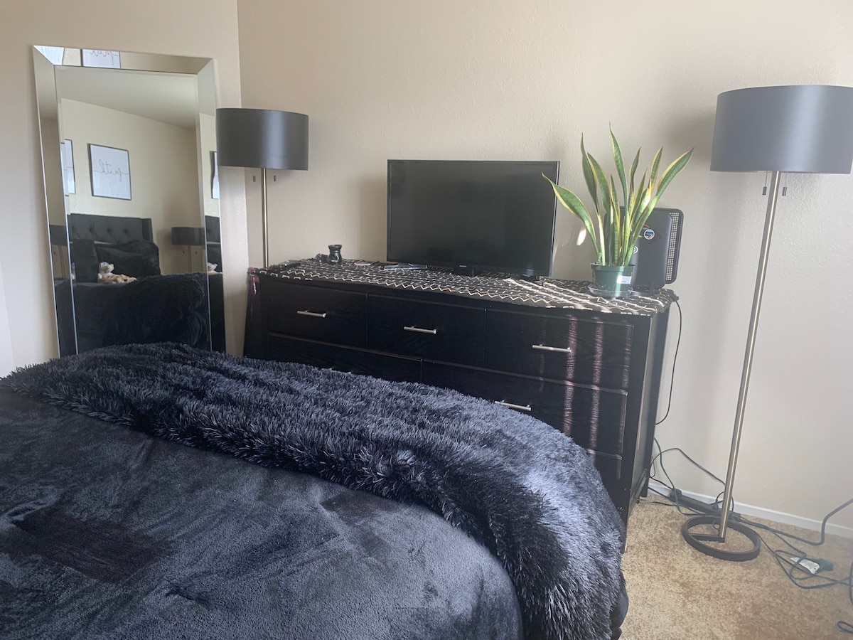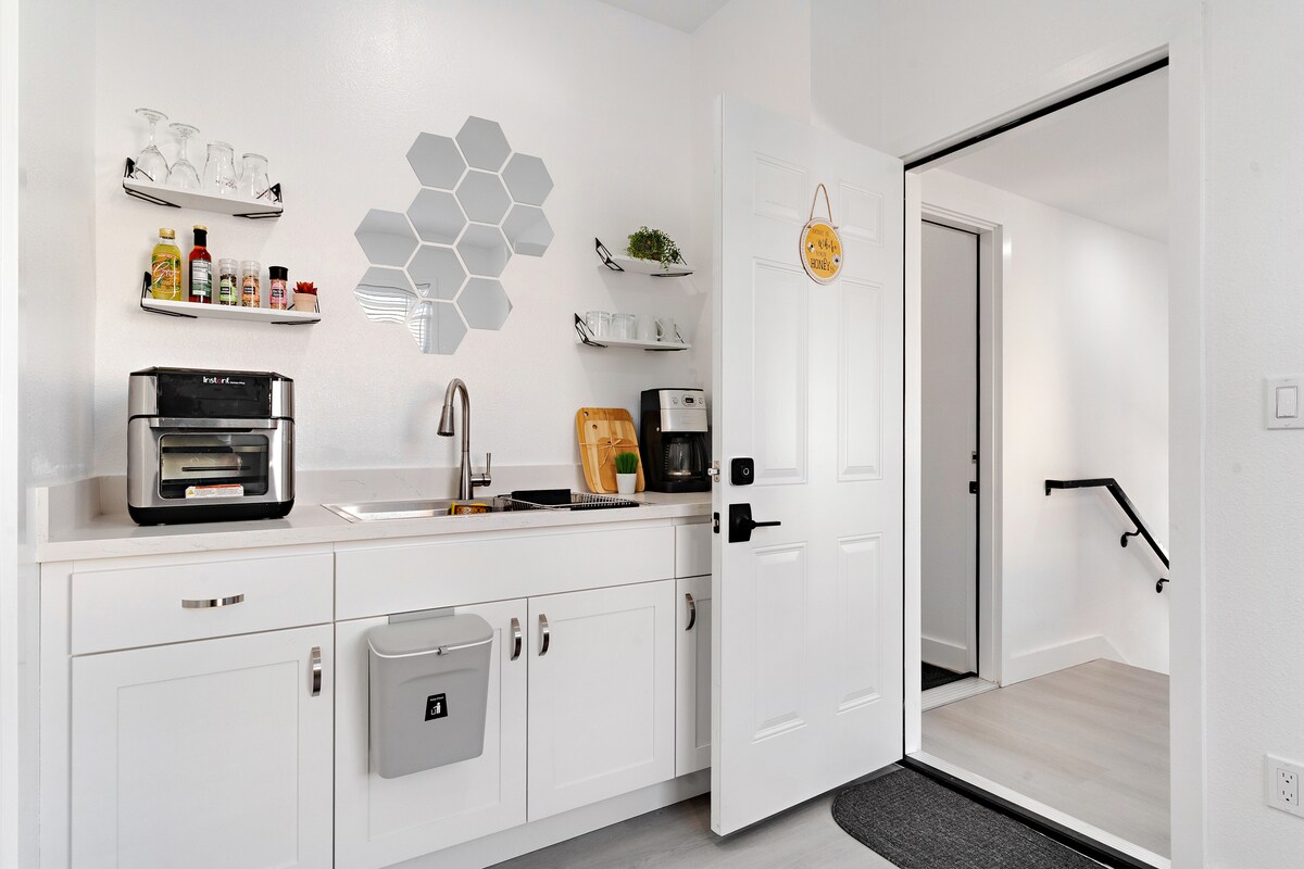 This modern, newly renovated property offers a private bedroom with a comfortable queen size bed, a sleek bathroom, and a well-equipped kitchen. The shared laundry room and patio area provide added convenience for a seamless stay. Nestled in a prime location, you'll be close to hospitals, shopping, and the airport, making it perfect for travelers seeking a home away from home. Experience a relaxing, worry-free stay in our cozy, stylish space designed with your comfort in mind.