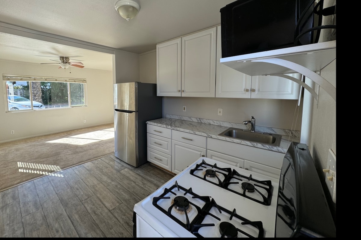 The full kitchen is equipped with all the necessary amenities, including a standard-size refrigerator and stove range, allowing you to prepare your favorite meals at your convenience.