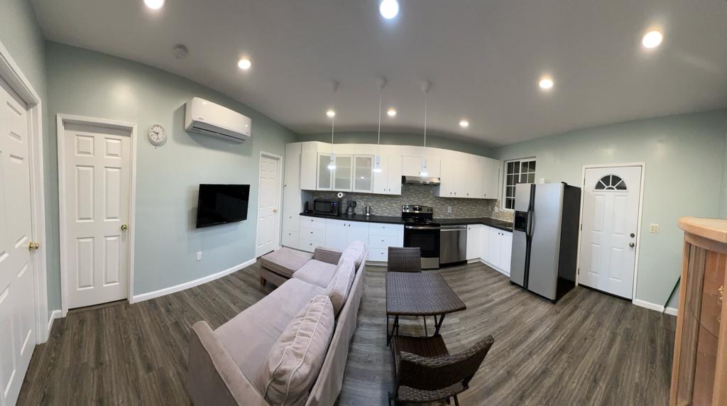 The front portion of a large house includes 1 bedroom and bathroom, a living room with a bunk bed, a kitchenette, and a whole kitchen located in the backyard, designated front and back patio. Has its own private entrance. Laundry is located in the backyard as well. TV and high-speed internet is all included. The surroundings are nice and quiet and you'll be located in the suburbs, not too far from the city but far enough to enjoy a less busy environment.