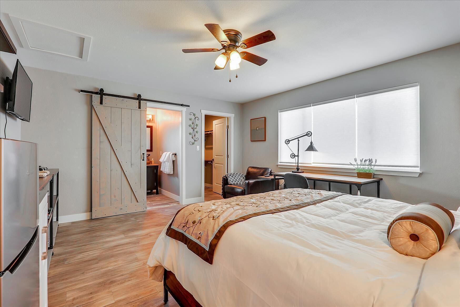 The bedroom has a comfortable queen sized bed, leather couch, 43" Flat screen TV, large desk for working, and ensuite bathroom with shower. Free access to our laundry room which is in a separate entrance in the building.