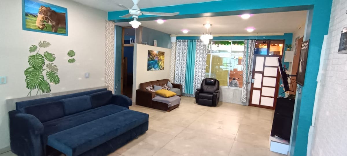 Located in San Ramón, our home offers a unique experience in the Chanchamayo🌴. Enjoy four rooms with private bathroom and hot water🚿, three double and one twin (two rooms inside the apartment and two outside on the same floor). Relax in our open concept living room, kitchen, and dining room 🍽️ and enjoy the balcony with panoramic views🌄. Book today and experience the magic of the Central Jungle! 🏞️