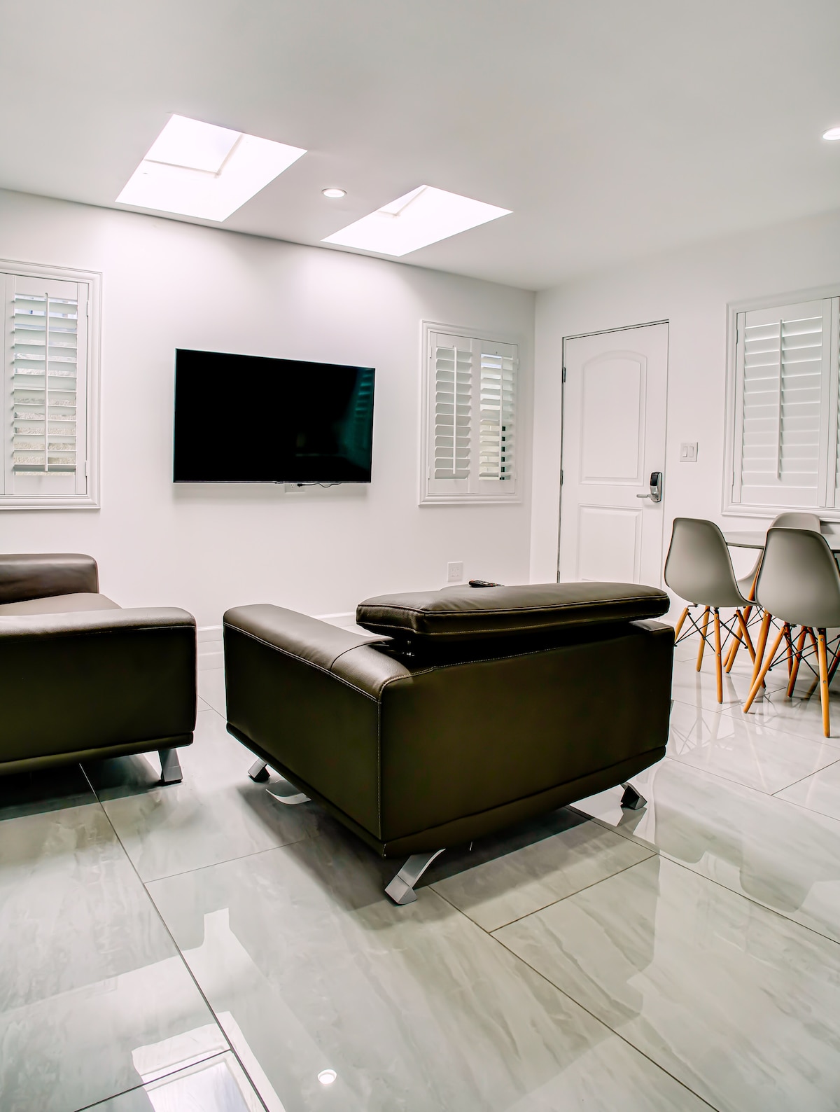 Our home exudes a luxurious atmosphere with its elegant flooring, marble countertops, and a lavish marble shower. The living area is generously sized, offering various amenities for your comfort, including a 65" 4K Smart TV, high-speed 1000 Mbps internet, and an assigned parking spot for added convenience.