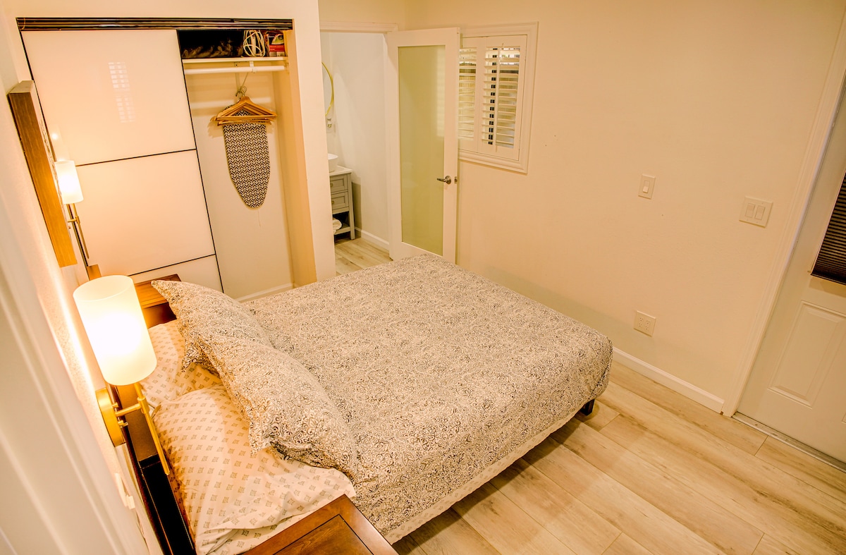 The Bedroom promises a serene night's rest on a queen-sized medium-firm memory foam mattress, accompanied by thoughtfully provided cotton bedding and linens for your comfort. An iron and ironing board are at your service to keep your clothes looking sharp, and a hamper is thoughtfully provided for your laundry needs.