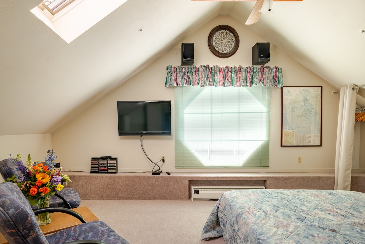 The primary bedroom features a king-size bed with a luxurious hybrid latex medium-firm mattress with a 3” soft natural latex topper, as well as a Smart TV for cozy evenings.