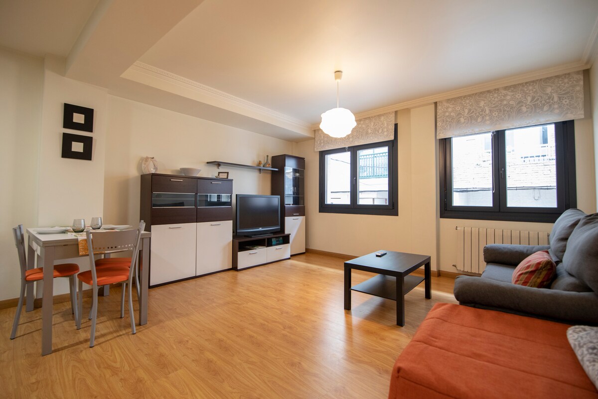 + Living-dining room. Dining table with extensible, 4 chairs. 3-seater sofa. LCD TV 32". Foldable extra bed.