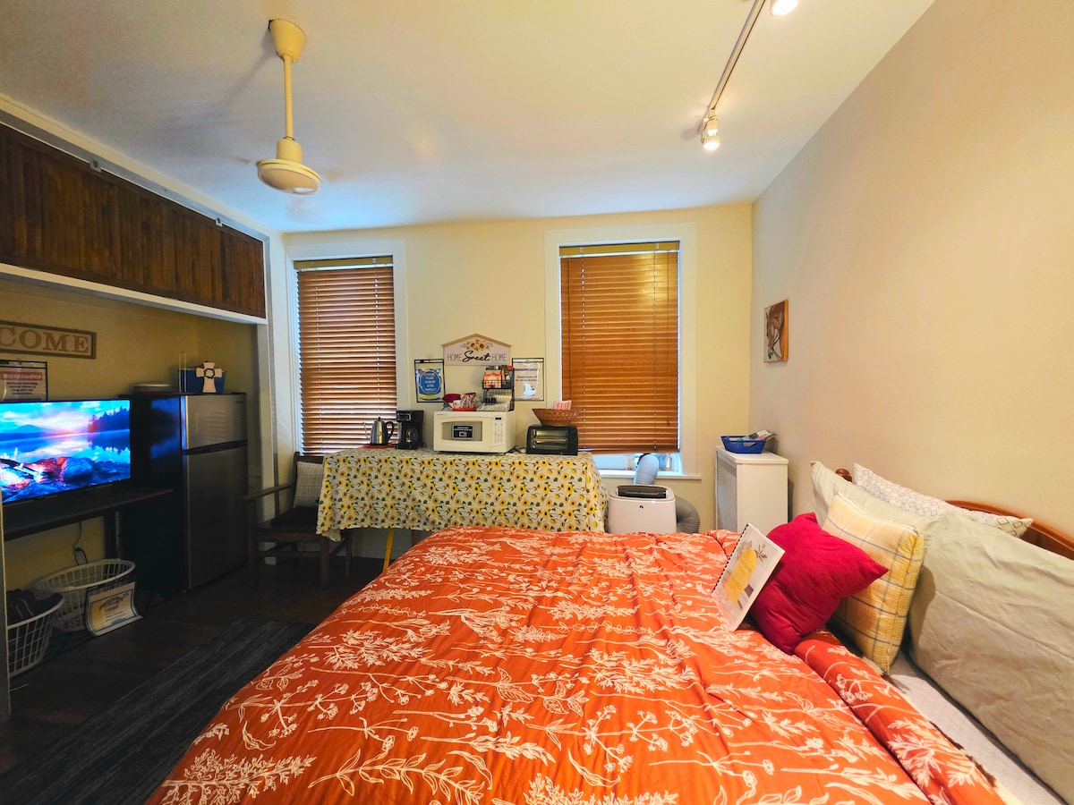 -The master bedroom features a queen-size bed with quality linens, room darkening curtains, a closet, a five-drawer dresser, and a luggage rack. It also includes a smart TV with streaming apps, bedside charging ports, a ceiling fan with dimmable lights, and a desk for a fully private workspace.