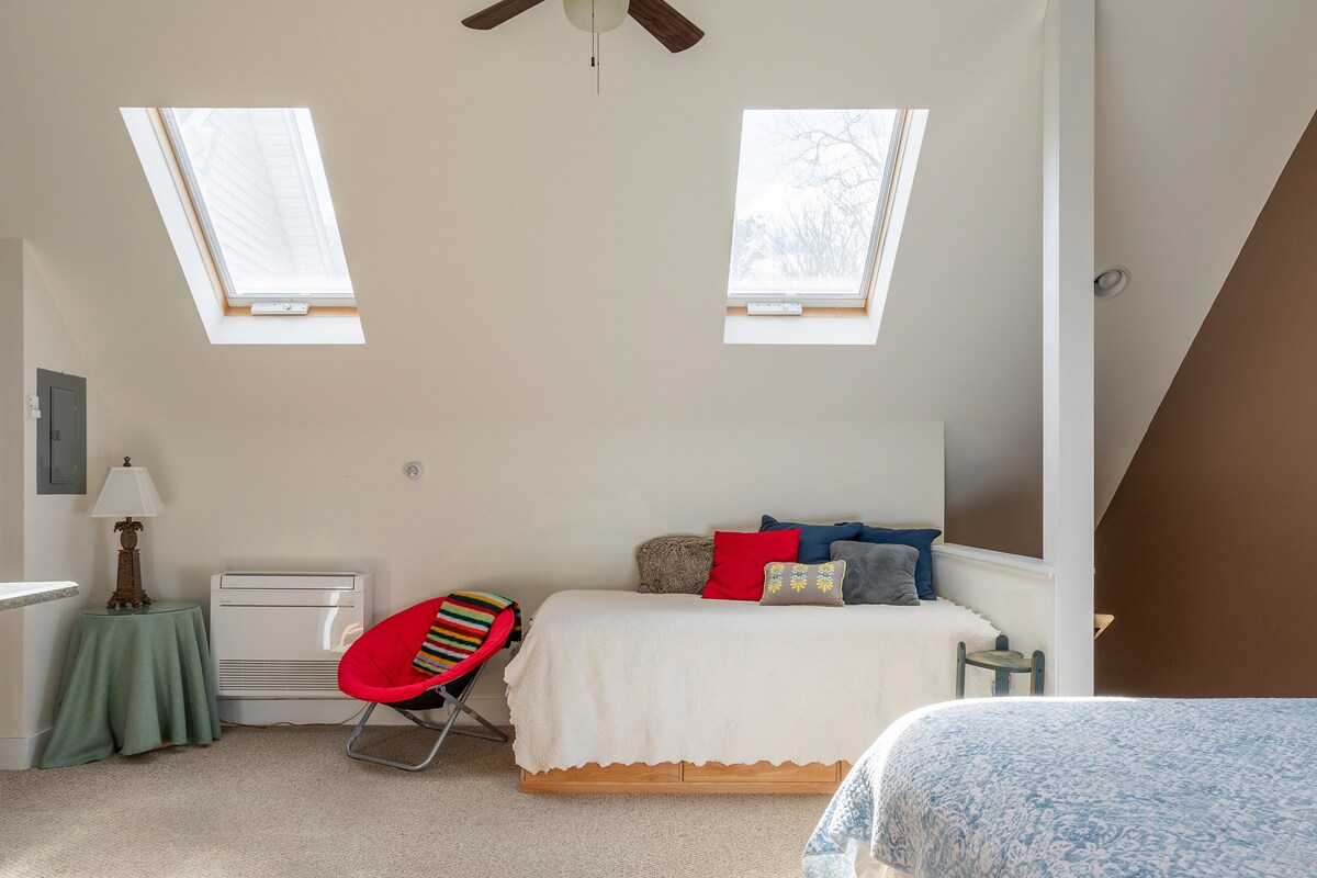-Second bedroom also features a queen-size bed and an additional twin bed, comfortably accommodating three guests. It features a wall mounted TV with streaming apps, bedside charging stations, a ceiling fan with dimmable lights, room darkening curtains, and a dresser.