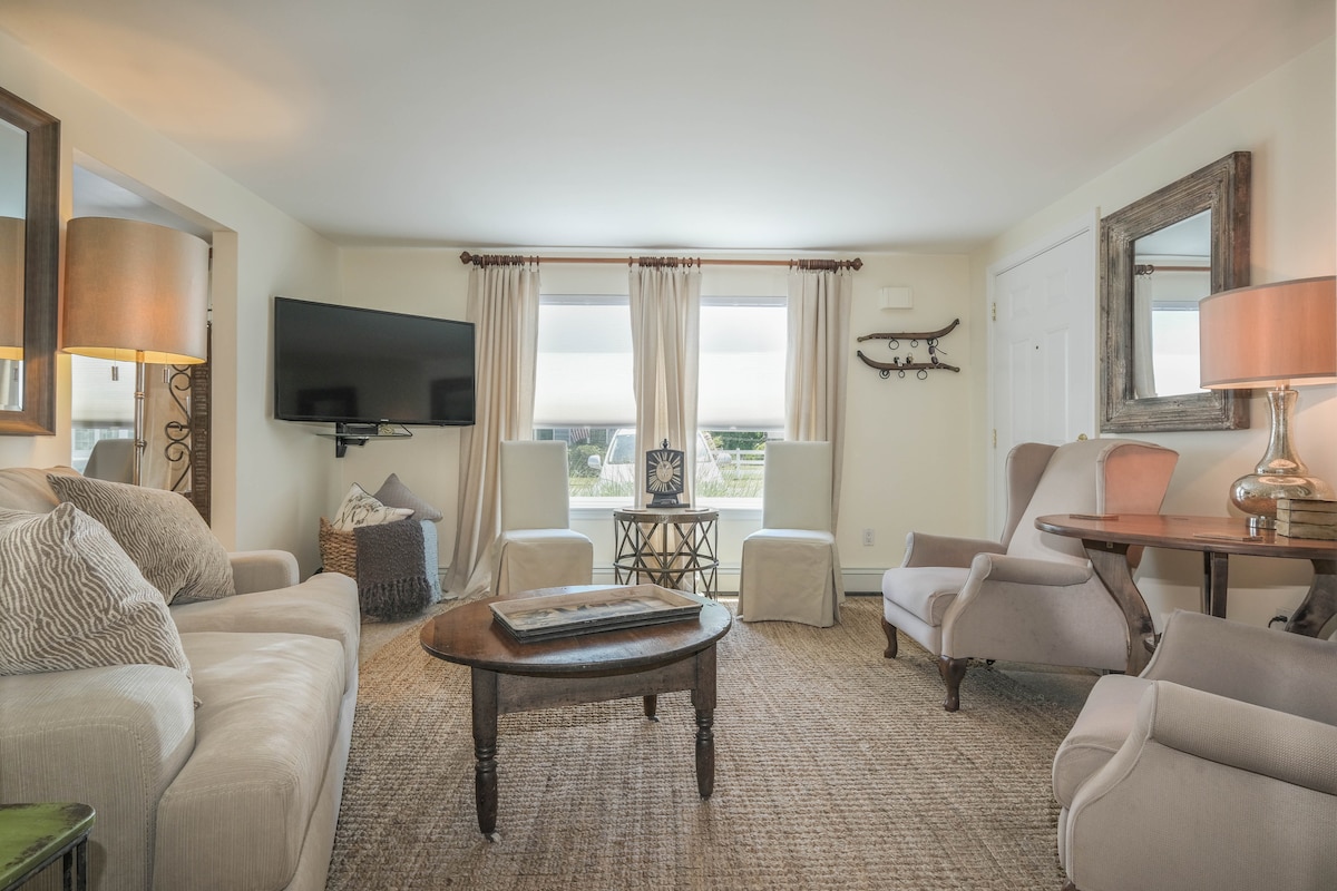 -Open concept living room includes a 75" smart TV preloaded with streaming apps, a comfortable couch and two swivel chairs - ideal space for a movie night