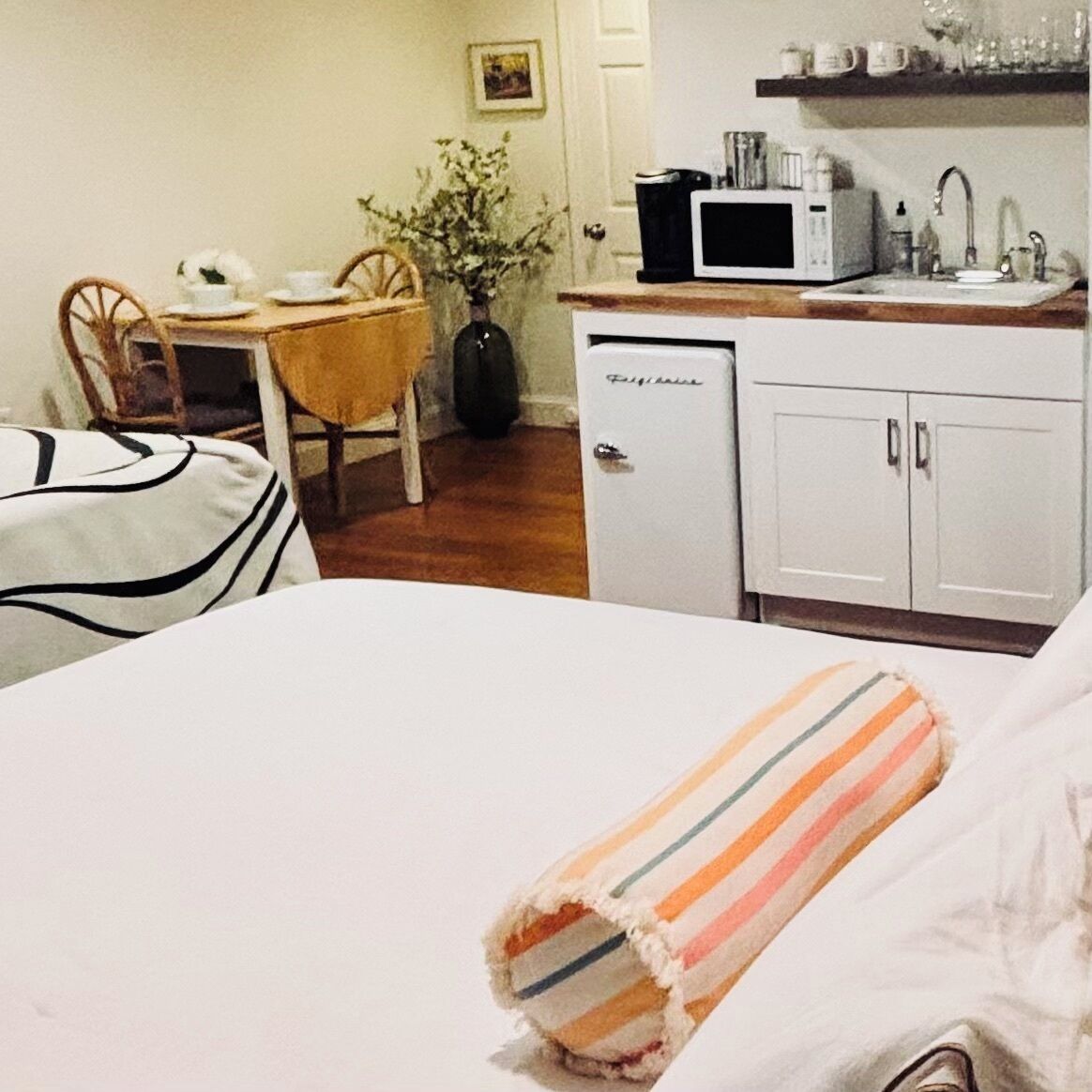 The apartment is simple and tasteful, approx. 700 sq. comprised of living room with a love seat, futon couch, a high top glass table and chairs for dining, roku smart tv, coffee table and a bookshelf with good reads. Down the hall and carpeted throughout is the bedroom with queen size bed, black out shades, charging station, white noise machine, antique desk and chair, distressed bureau and closet. The kitchen has a coffee maker, refrigerator, oven, stove, plates/cups, wine glasses, toaster oven, utensils, pots/pans and a high top table with chairs.