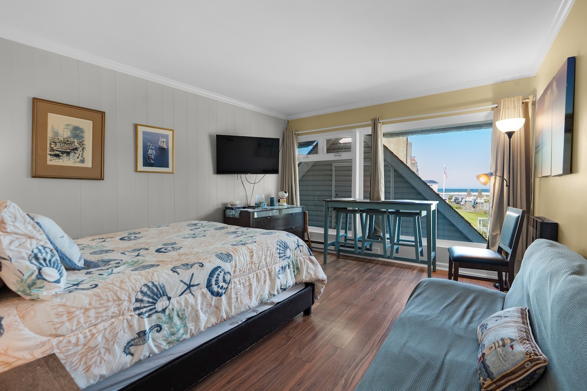Looking for a few nights away or just don’t feel up to that drive home? This second-floor studio checks both of those boxes! It has a kitchenette, a queen bed and is ready for your escape. The beach and our seasonally heated pool are just steps away. Keep an eye on our iconic frog, who has graced our property since the 1920s! Restaurants and a market are blocks away.