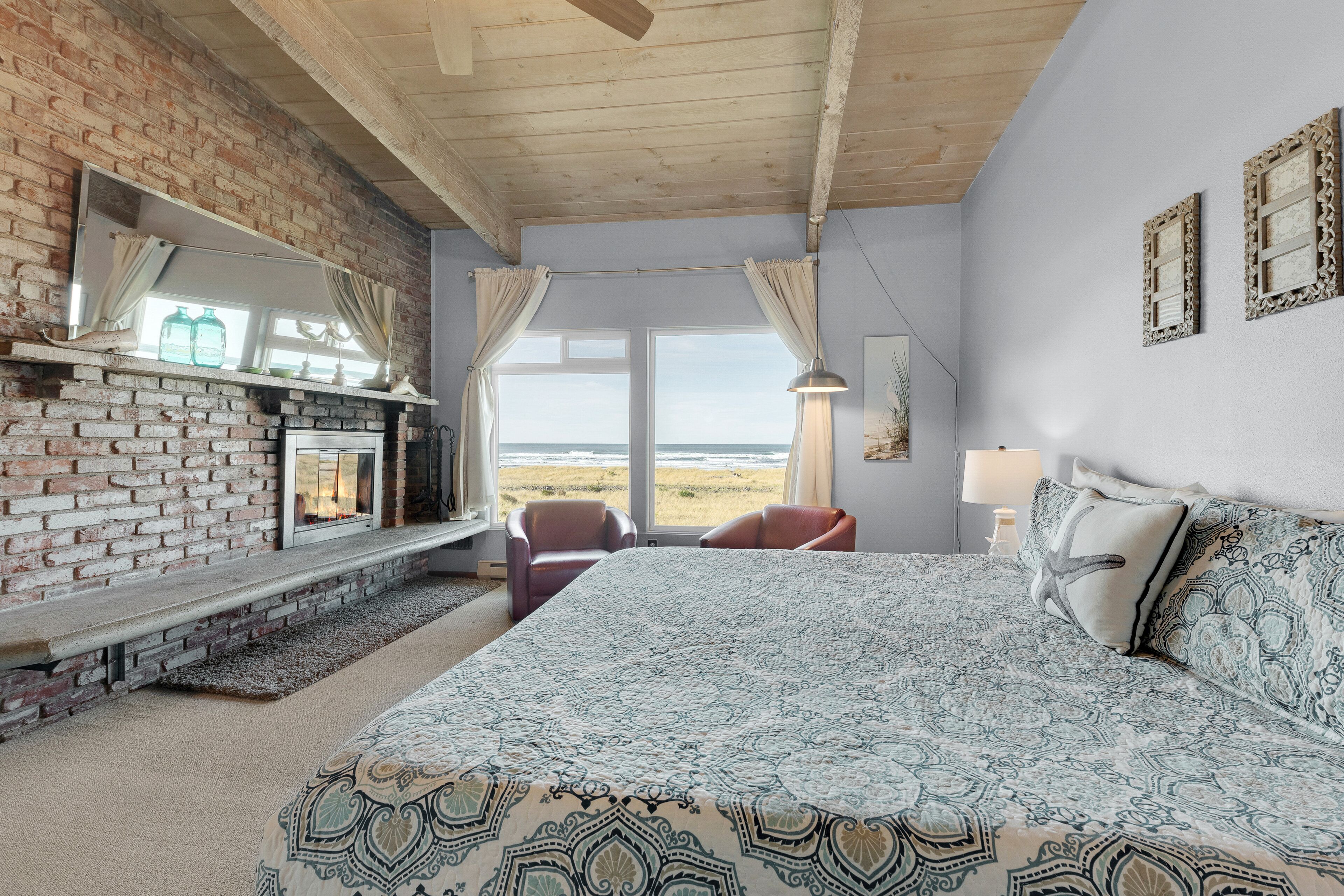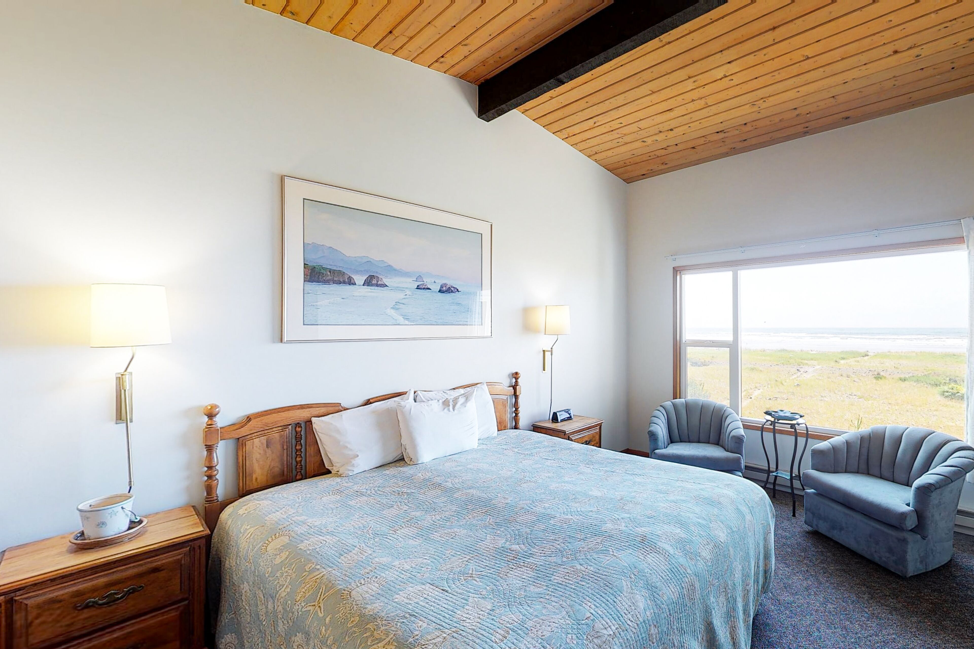 This serene first-floor oceanfront studio has a kitchenette and an electric fireplace with great ocean views! Let the sound of the sea soothe you to sleep. Use the telescope to admire the Pacific from a different point of view. Enjoy a relaxing dip in our seasonally heated pool or use one of our charcoal grills to prepare your dinner. Cozy and romantic, you're sure to enjoy your stay here. Restaurants and a market are nearby, and downtown Seaside is just a mile north on the Prom.