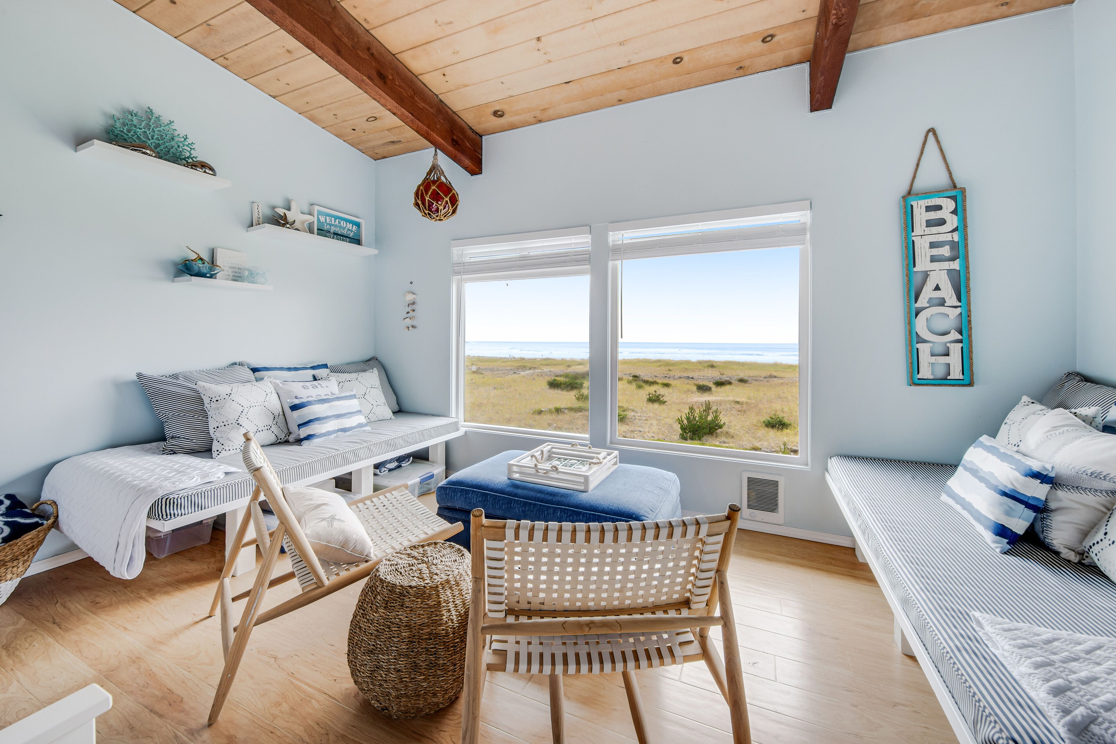 Welcome to The Riptides, a quintessential beach house offering 75 feet of ocean frontage and stunning views of where the Necanicum River meets the Pacific Ocean. Located in the highly sought-after North Prom area of Seaside, this beautiful home comfortably accommodates up to 9 guests, including your furry friend, making it the ideal Oregon Coast vacation rental.