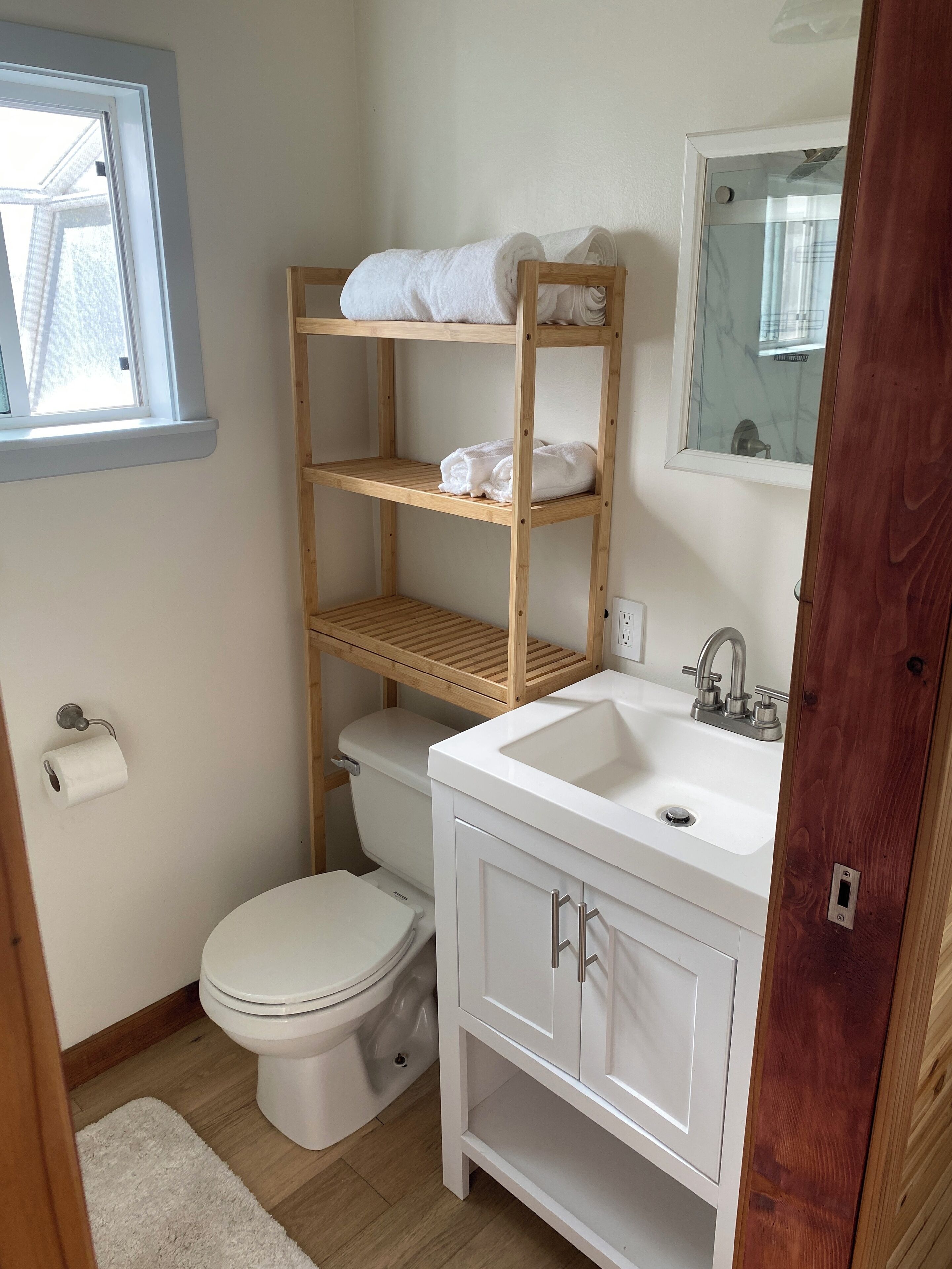 The bathroom includes a shower with hot water, clean towels, and scent free shampoo and conditioner and soap.