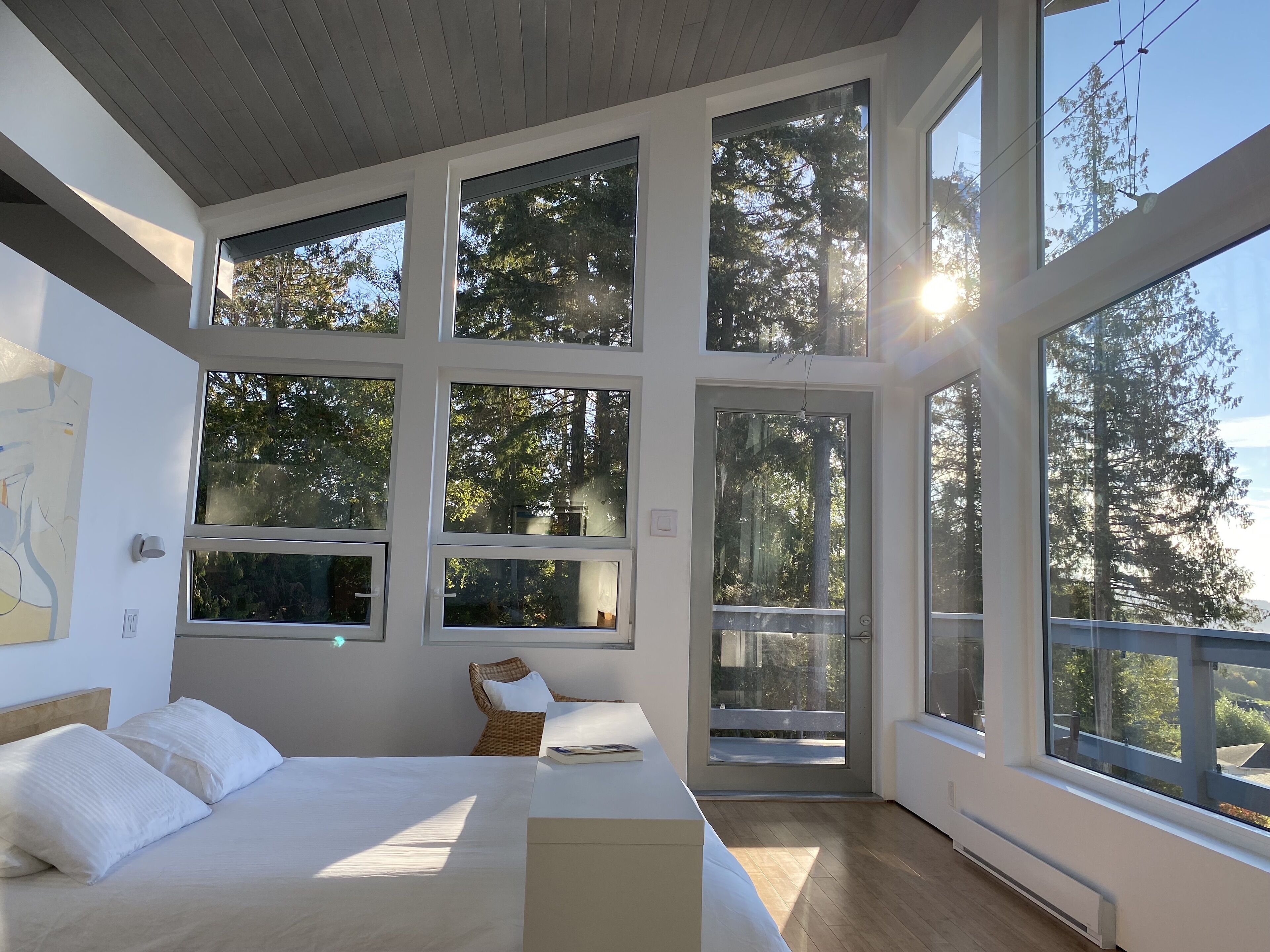 The Art Gallery suite Invites guests that need a break from the city, want to explore nature go for walks, relax, read, or work. The suite has a comfortable desk and ergonomic office chair. We are located in a private setting. Suite bedroom and lounge both feature French doors giving direct access to the deck. The suite is part of a contemporary architect designed art living studio. The suite has its own private entrance.