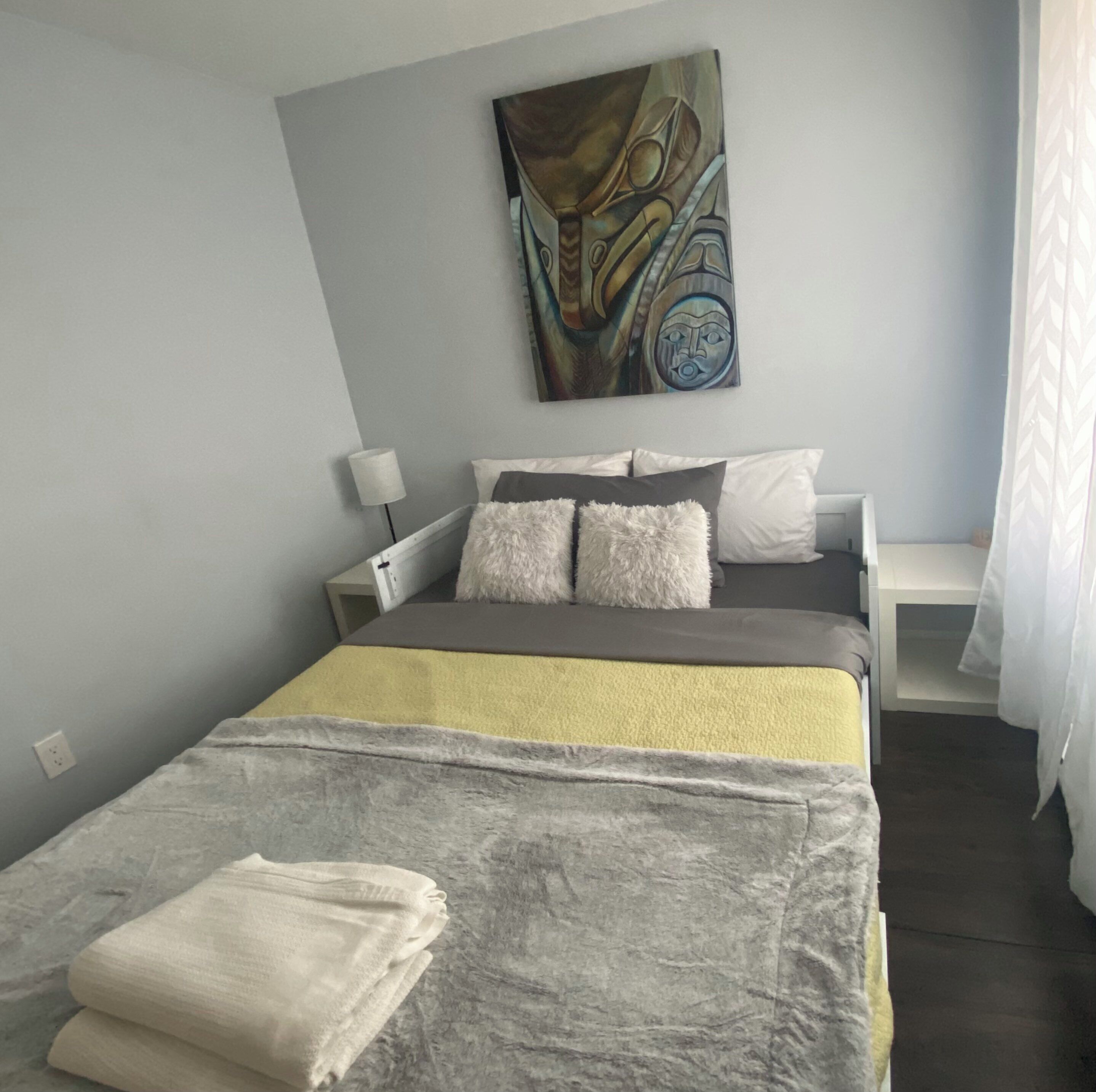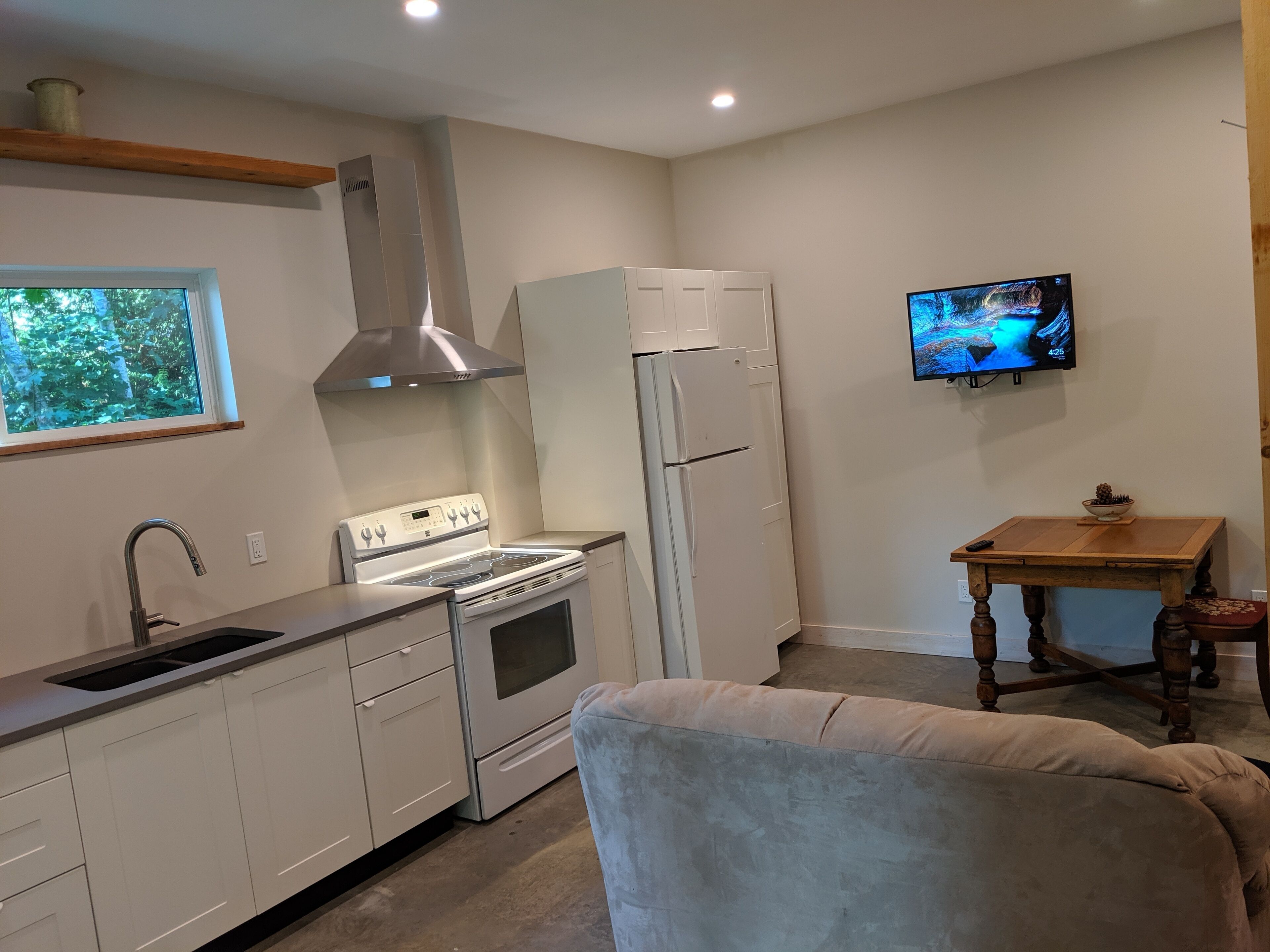 Indulge in our extensive book collection, play a game of Scrabble, or log in and stream your favourite shows on the 43-inch LG TV. This studio has everything a couple or solo traveller needs to relax or focus on work while on short-term contracts in Sechelt.