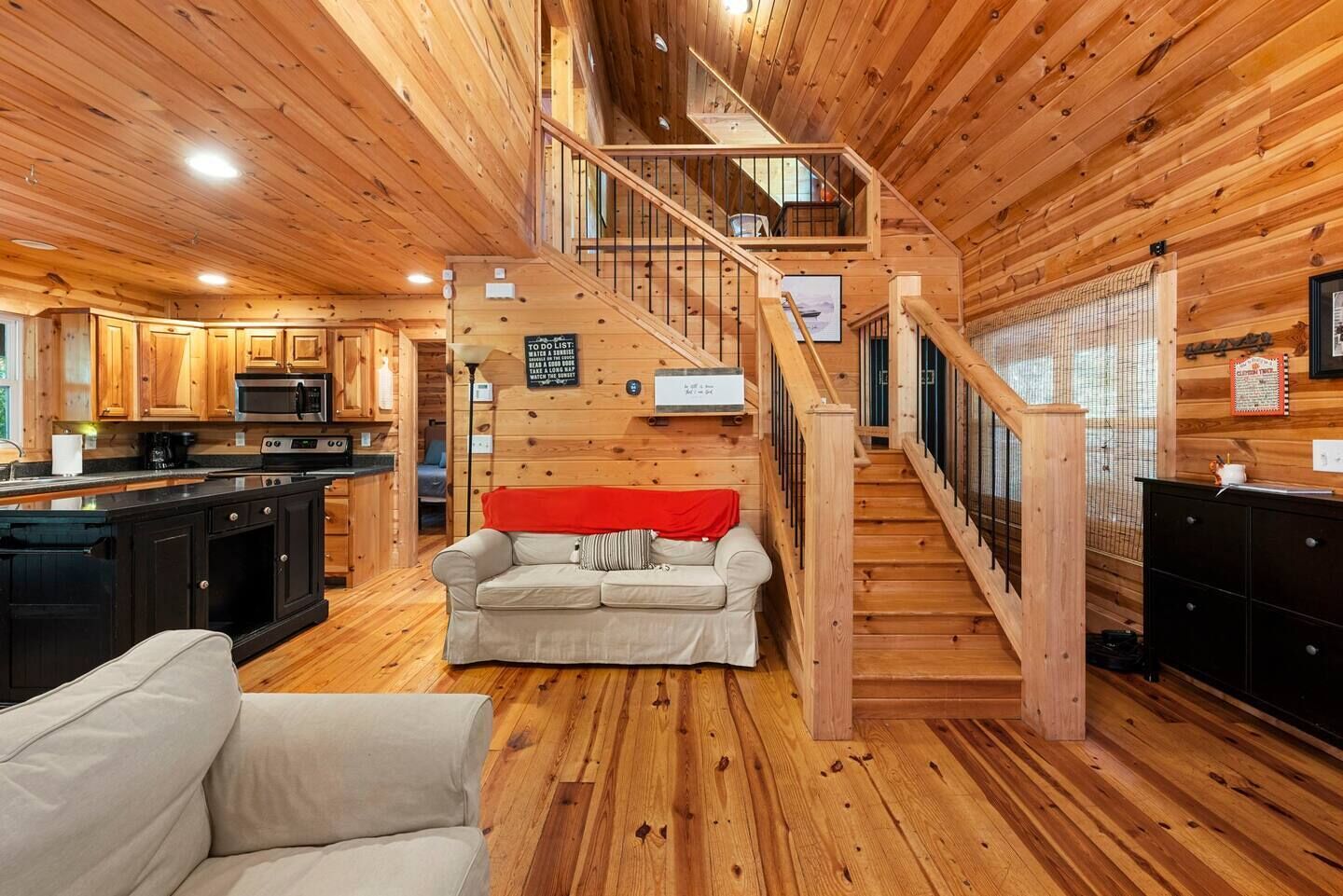 This is a unique, cozy space! It has an open floor plan with a huge living/dining area. The cozy kitchen has a mini coffee bar for you to enjoy in the morning with a stove and microwave. There is a bedroom downstairs with a full bath accessible through the kitchen or bedroom. There is also a loft upstairs with a cozy king bed. You can relax in the chairs out front in the evenings or enjoy some time by the firepit outside - s'mores included! The driveway will accommodate boat trailers!