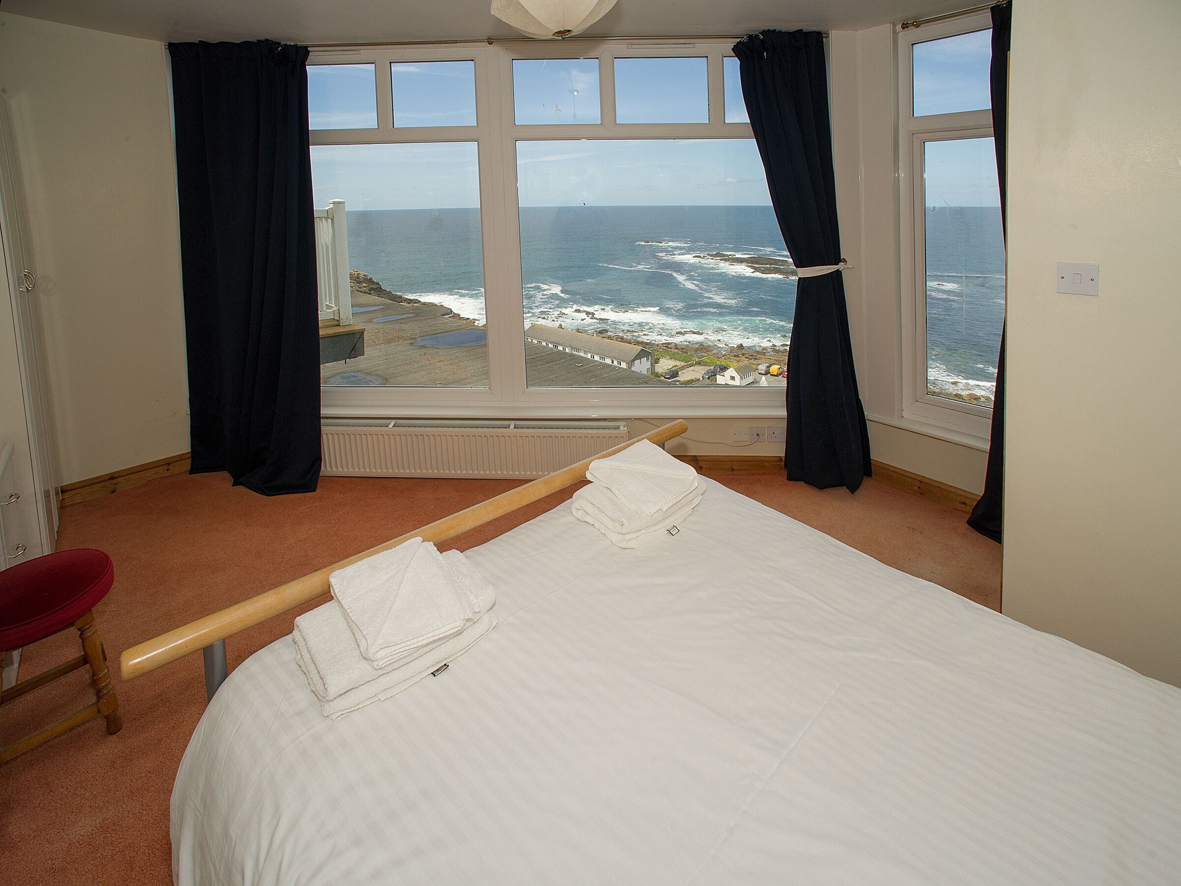 The velux roof windows look out over the view of the Atlantic Ocean. The fishing harbour in view, and just one minute from the famous White sands surf beach. Close to the Old Success Inn, coastal walks and fantastic open top bus route to St. Ives and just a few miles from the famous Minack theatre, with its cliff top summer performances.