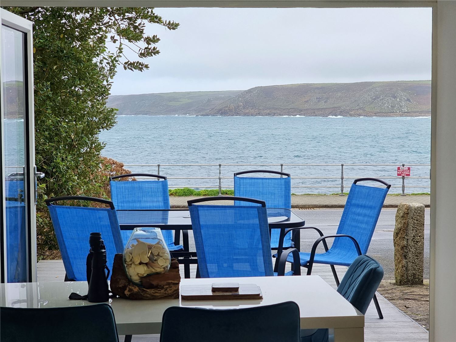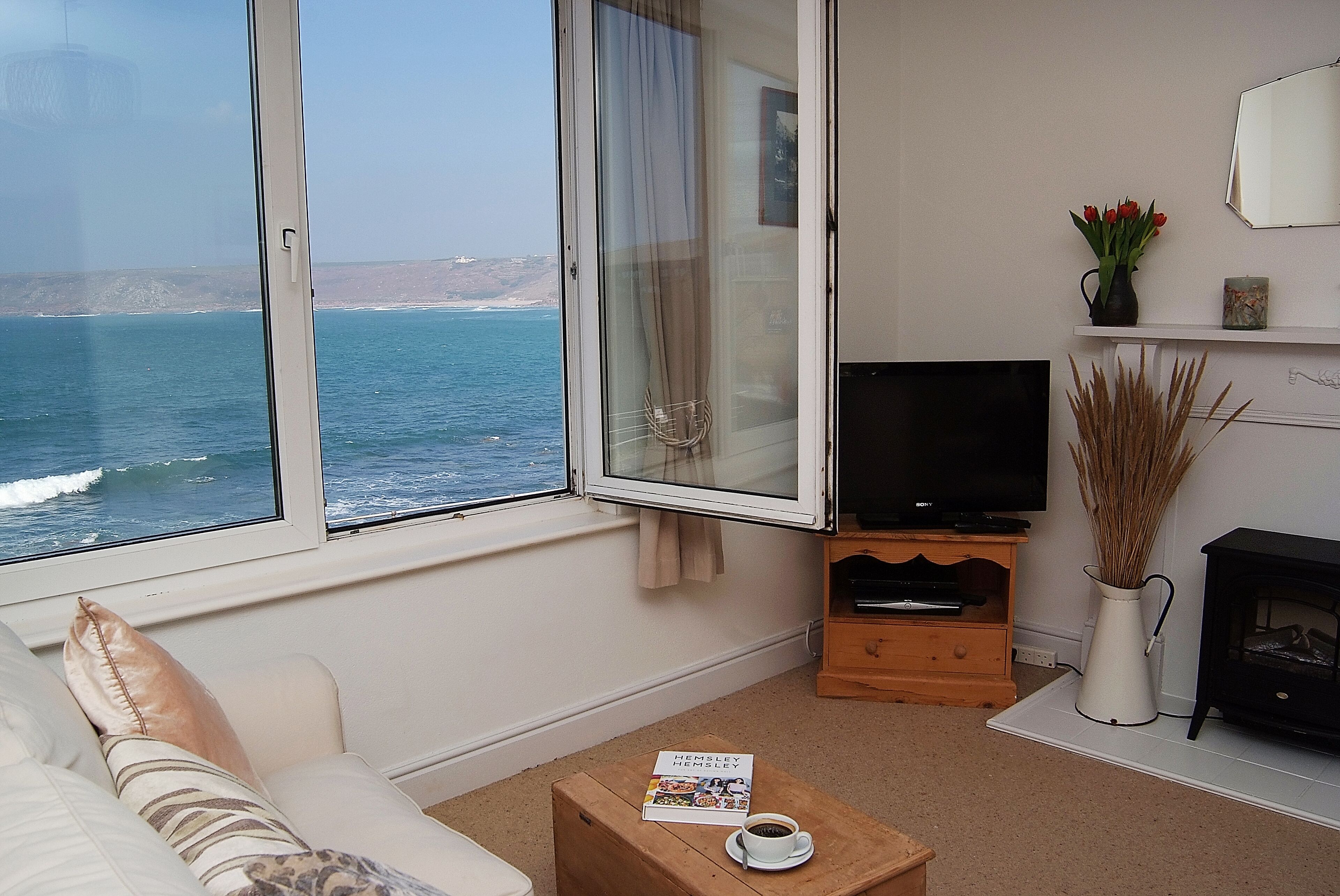 The living area has a new large L-shaped sofa with enough room for everyone to spread out and relax. Our new Smart TV has satellite channels, perfect for those Netflix 'n' Chill evenings, and the bi-fold doors of our juliette balcony mean you can open up the living area to the sound and sights of the Bay. With spectacular views over the Cove whatever the weather, you'll have plenty to keep you entertained. We also have fast Wifi (but you can always blame Cornish signal if you really want to cut yourselves off - everyone back home will believe you) vintage boardgames and selection of books.