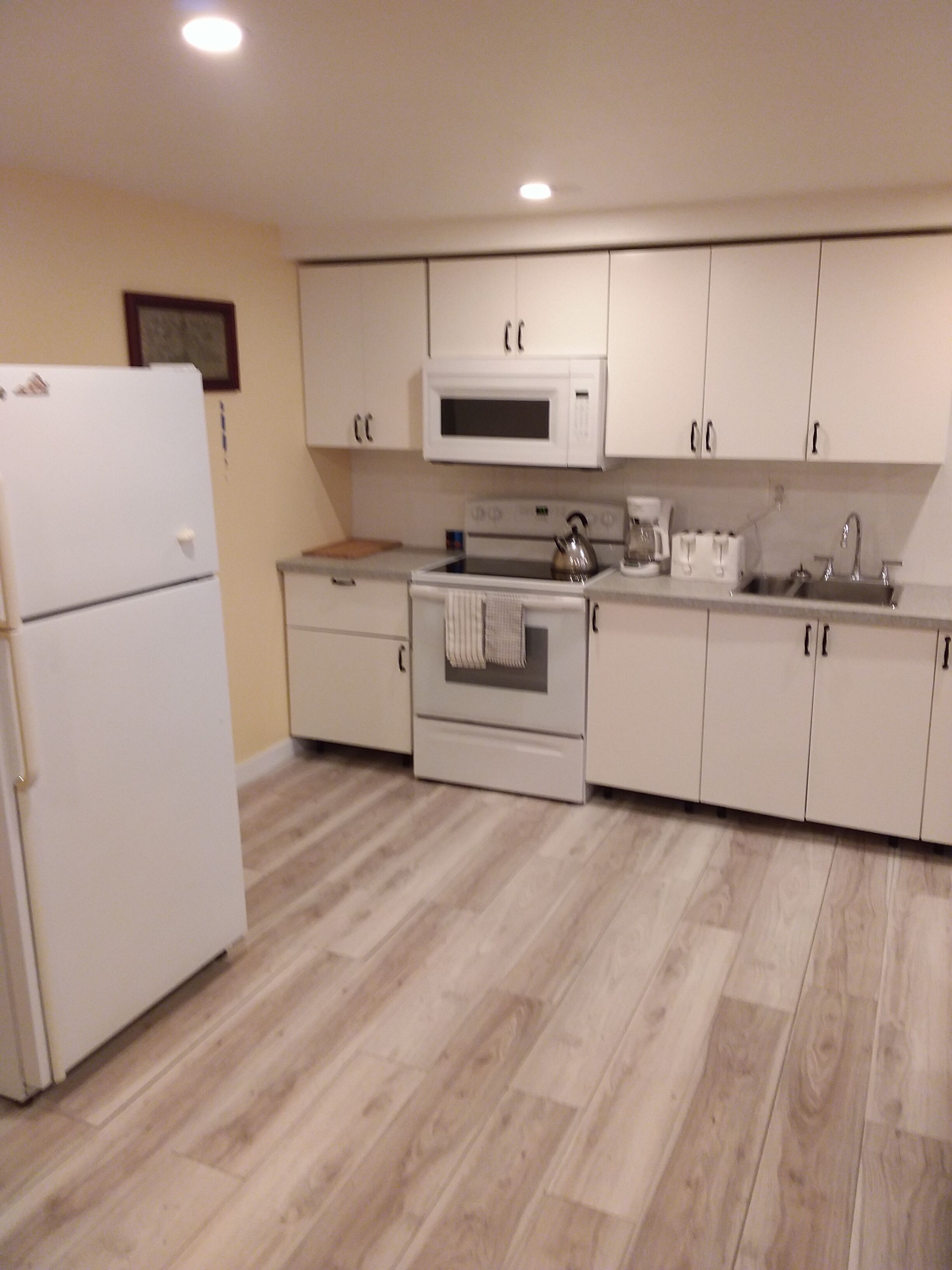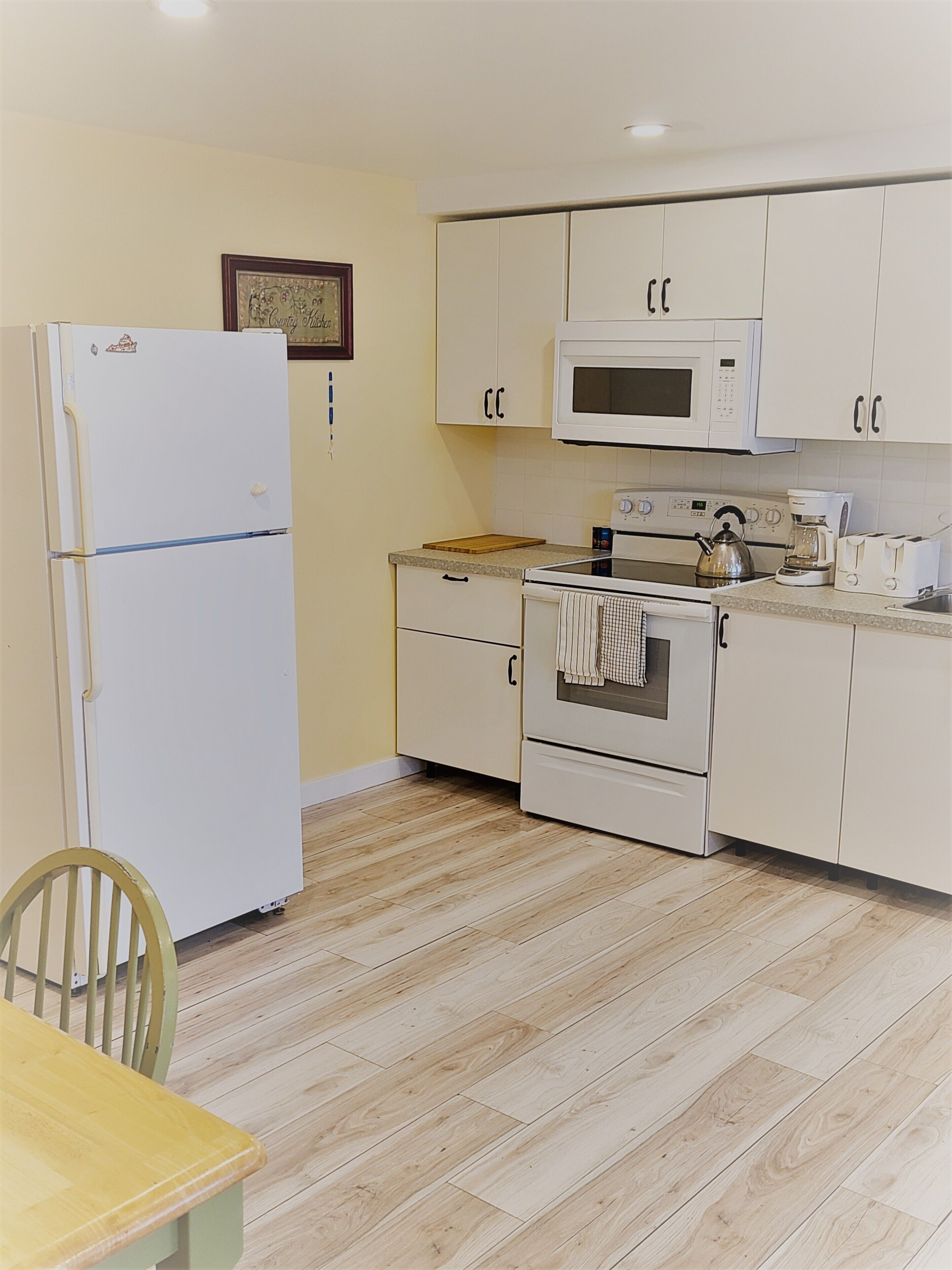 Kitchen with essentials: fridge, stove, microwave, toaster, and coffee maker