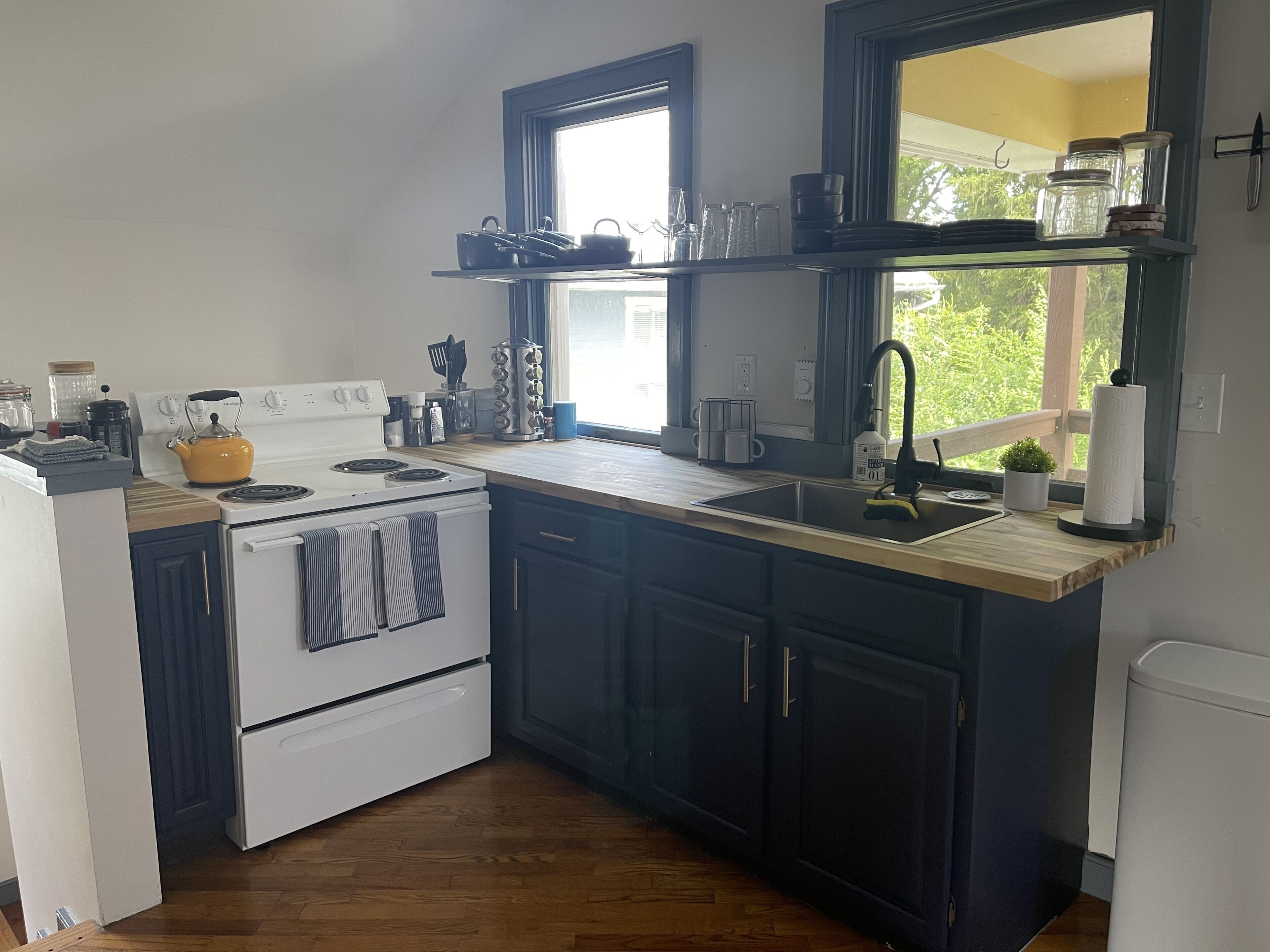 Kitchen: Modern, cozy yet charming, with granite counters, handcrafted wood cabinetry, and Frigidaire refrigerator and cooktop with oven. Includes coffee machine, toaster, and all the essential cookware and bakeware necessary to make a simple meal. Our kitchen comes stocked with the essentials: mixing bowls, spoons, and cups; cutting board; pizza cutter; wine opener; baking sheet, pots, and pans. The only thing it excludes is a dishwasher.