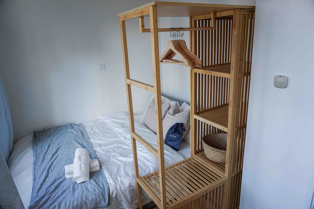 About the bedroom: features a double sized bed ( 4ft by 6ft), comfy mattress, desk with chair , wardrobe