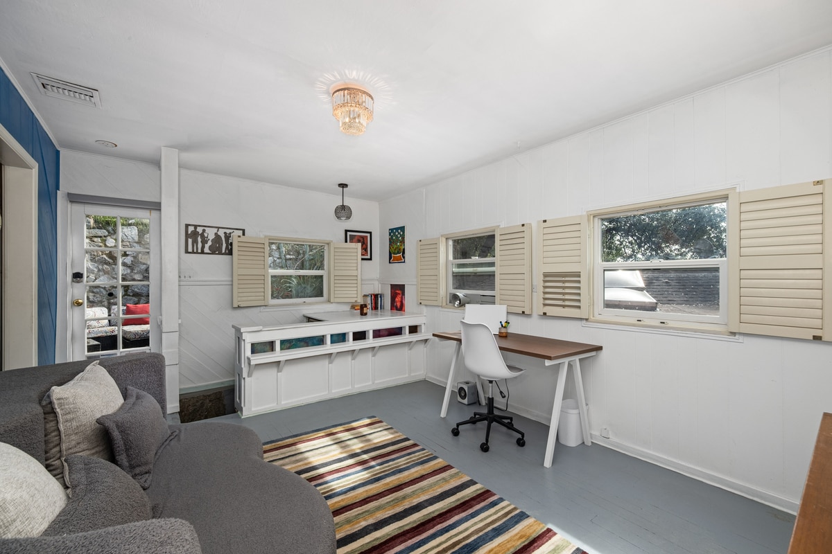 This is a studio cottage with a lower home below. Private entrance. Private patio with outdoor seating and hot tub. This is an eclectic, historic neighborhood. Cottage includes a small kitchenette with stove, fridge, microwave, and sink. Private bathroom with shower. Includes a comfortable queen-size convertible foam bed/couch and a desk with adjustable chair. Lovely area, one block to iconic cafe Mary’s Market. One dedicated parking spot.