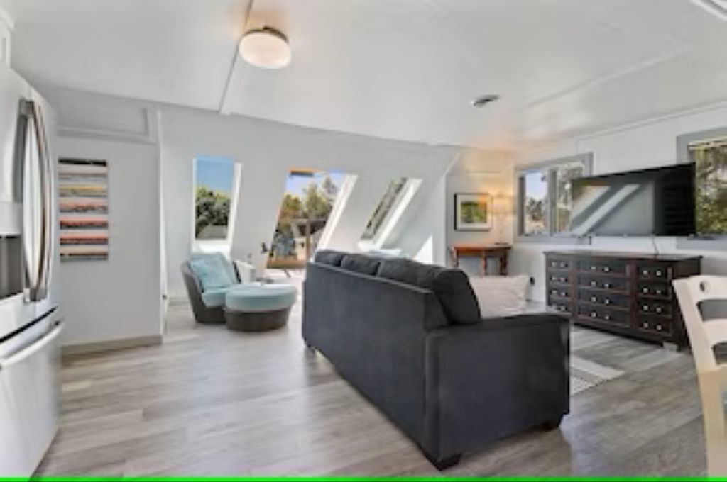 Outside, the patio feels private, with a partial view of the bay, yard games, a fire pit, and a Weber grill. The yard and driveway are shared, but you’ll have a private 2-car garage for parking.
