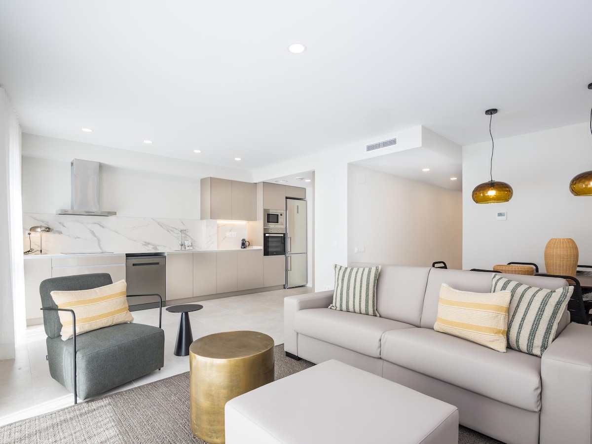 Throughout the apartment, tasteful and harmonious furnishings reflect a contemporary style suited for diverse preferences. The decor emphasizes comfort and elegance, creating a fresh, inviting atmosphere for guests. Everything is meticulously selected to offer a premium experience, including all necessary provisions for seasonal rentals such as kitchenware and linens.