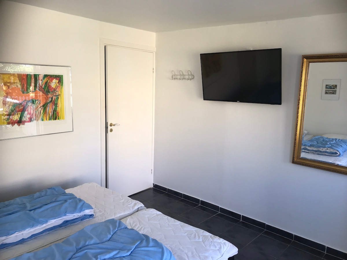 Lovely bright room - 2 people with possibility of extra bed, private entrance and south-facing terrace with barbecue and garden furniture as well as access to lovely garden and covered outdoor kitchen. The room includes new beds (double/single beds) and pillows/duvets, radio, TV, kitchenette with fridge, coffee maker, electric kettle as well as pots and cutlery