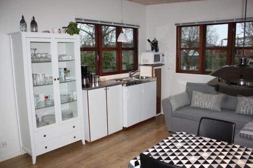 The apartment is 14 sqm and is a large room where there is a 2 pers. bed and a sofa bed that can be knocked out. There is an outdoor kitchen with water and barbecue ( THERE IS ONLY WATER OUTSIDE). The apartment features a small kitchenette with 2 hotplates, a coffee machine, an electric kettle and a microwave.