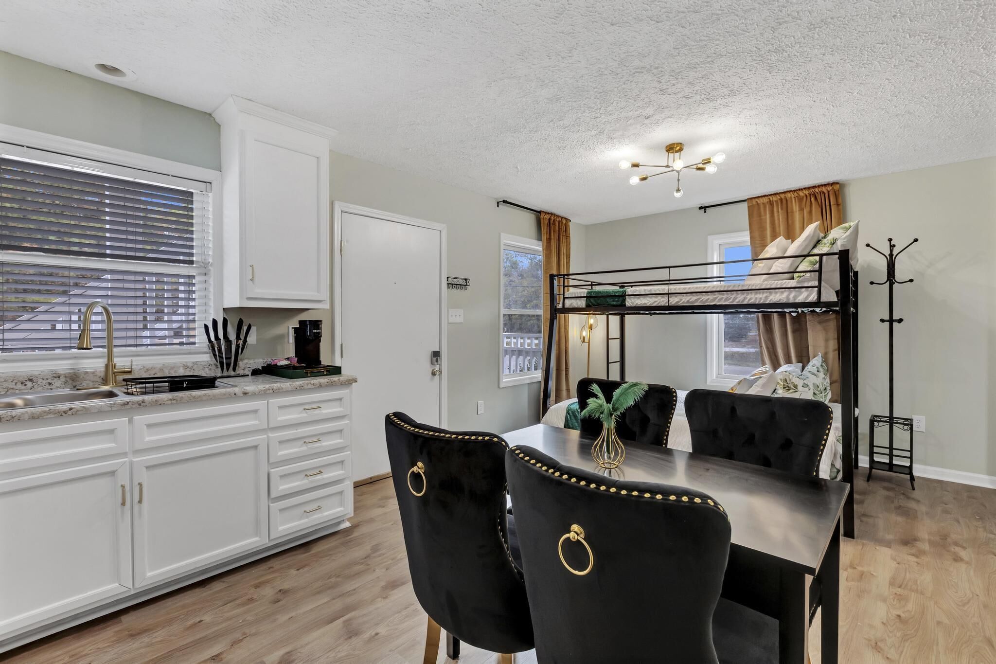 The living room includes a sleeper sofa, providing extra sleeping space without sacrificing comfort. With room for up to six guests, everyone can relax in their own cozy corner, balancing communal and private spaces.