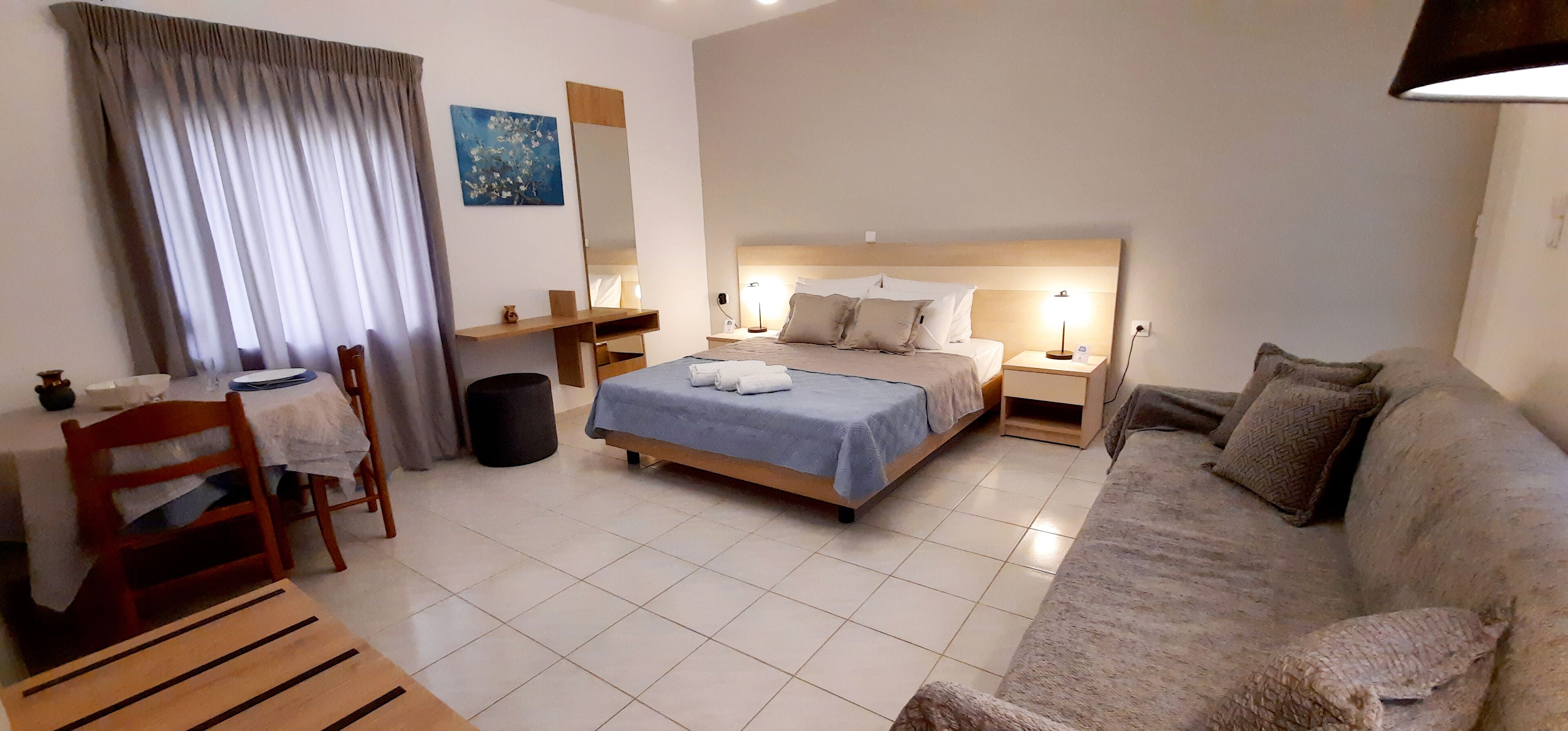A typical studio consists of twin beds with orthopaedic mattresses, a large built-in wardrobe, an air-conditioning unit, a TV with satellite channels, and a sofa, which converts into a single bed with real orthopaedic mattresses. Moreover, there is free wifi internet access.