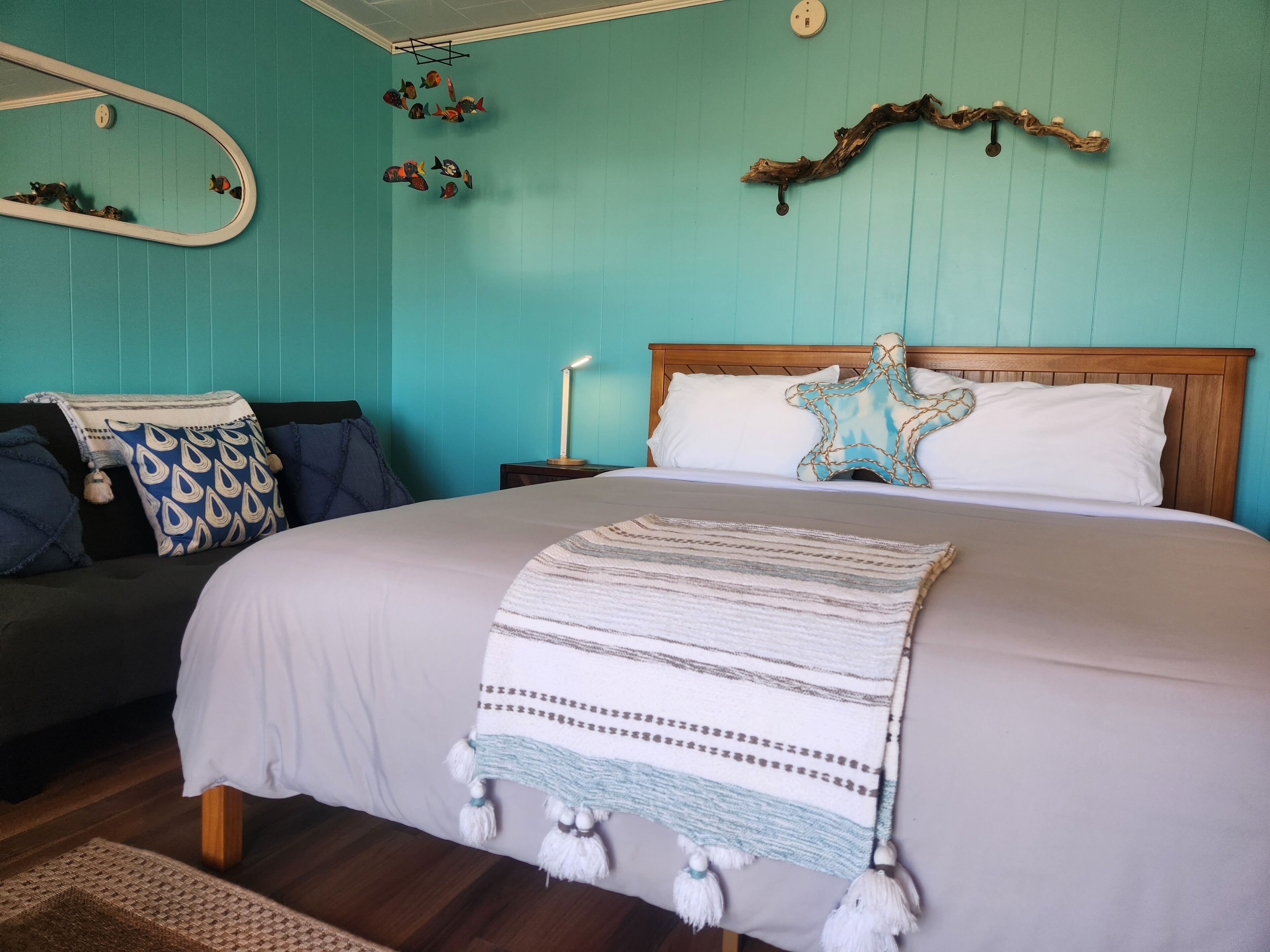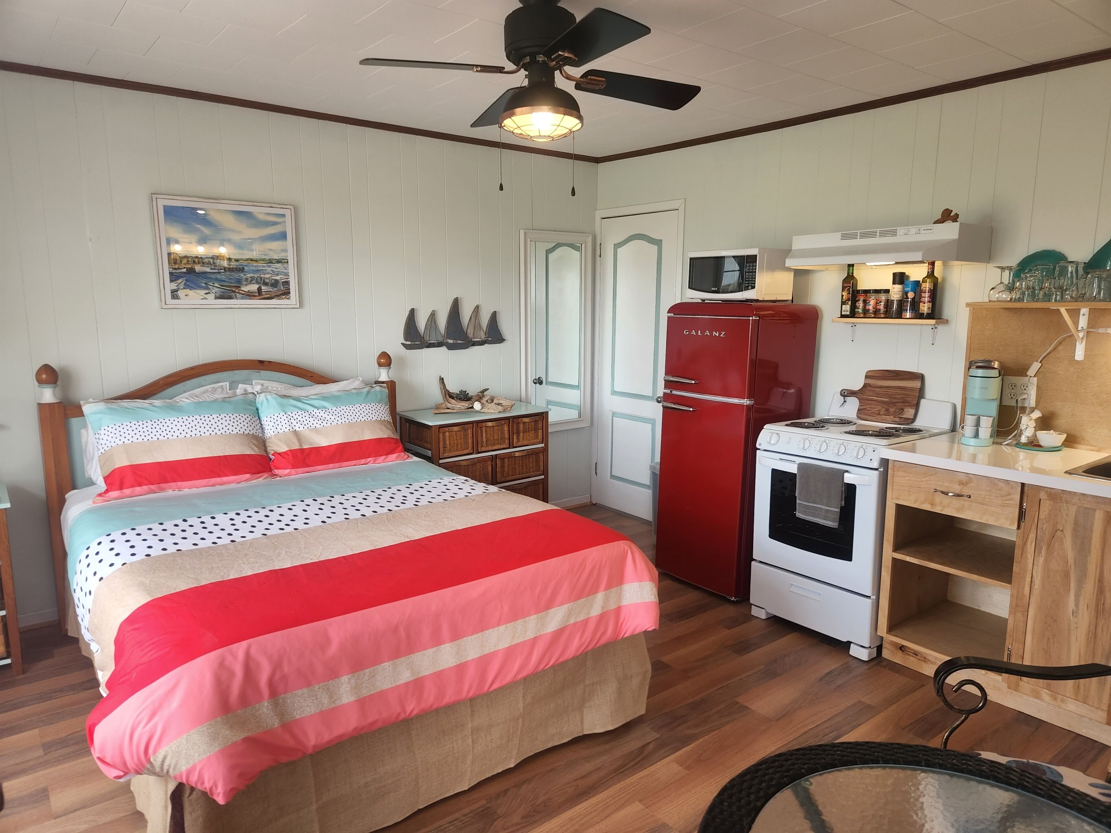 Siren's Beach Motel is Located Along a Vast White Sand Beach with Themed Rooms & Suites! Gone Coastal Suite is a Sailor’s Dream-stay-cation. A Coastal-Blue Suite with California King Bed & Futon, full kitchen, stove, fridge and farmhouse sink submerged in crystal blue ocean shades shaping into the Veranda with patio set.