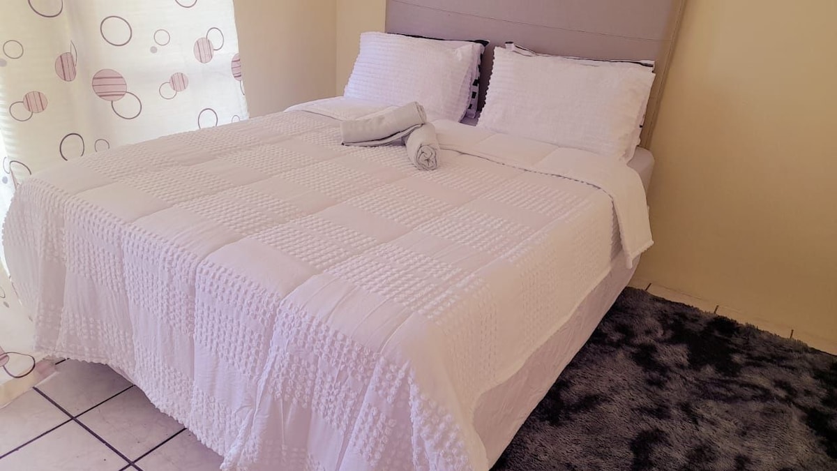 #Private flat with one bedroom, full kitchen and bathroom. DSTV and DVD player. Self catering unit. Close to shops and 10 to 15 minutes away from beach and main attractions . Free Wi-Fi and desk. One double bed suitable for a quick trip for business or longer stay for a single person or a couple.