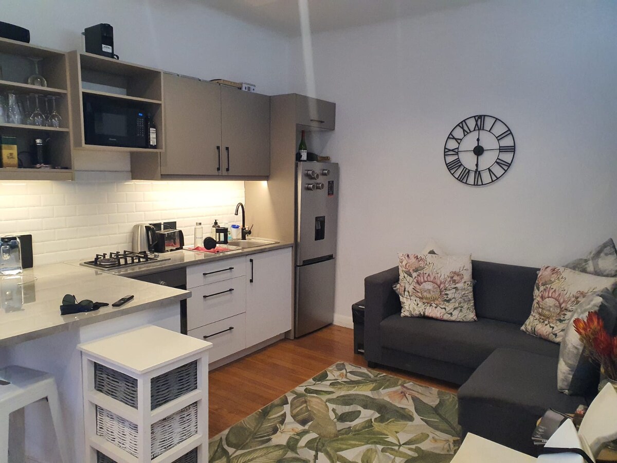 A beautiful, light and well equipped apartment. Well connected to surrounding towns Stellenbosch, Strand and Gordons bay. Airport is 20 minutes away. It features a bedroom-lounge area, flat screen TV with Netflix and free uncapped Wi-Fi, with speed 20mbps (upload & download) WiFi operational during loadshedding. The kitchen has a microwave, countertop stove, toaster, fridge, iron and ironing board, hair dryer, all crockery, pots/pans for cooking. The bathroom consists of a shower, toilet and basin.