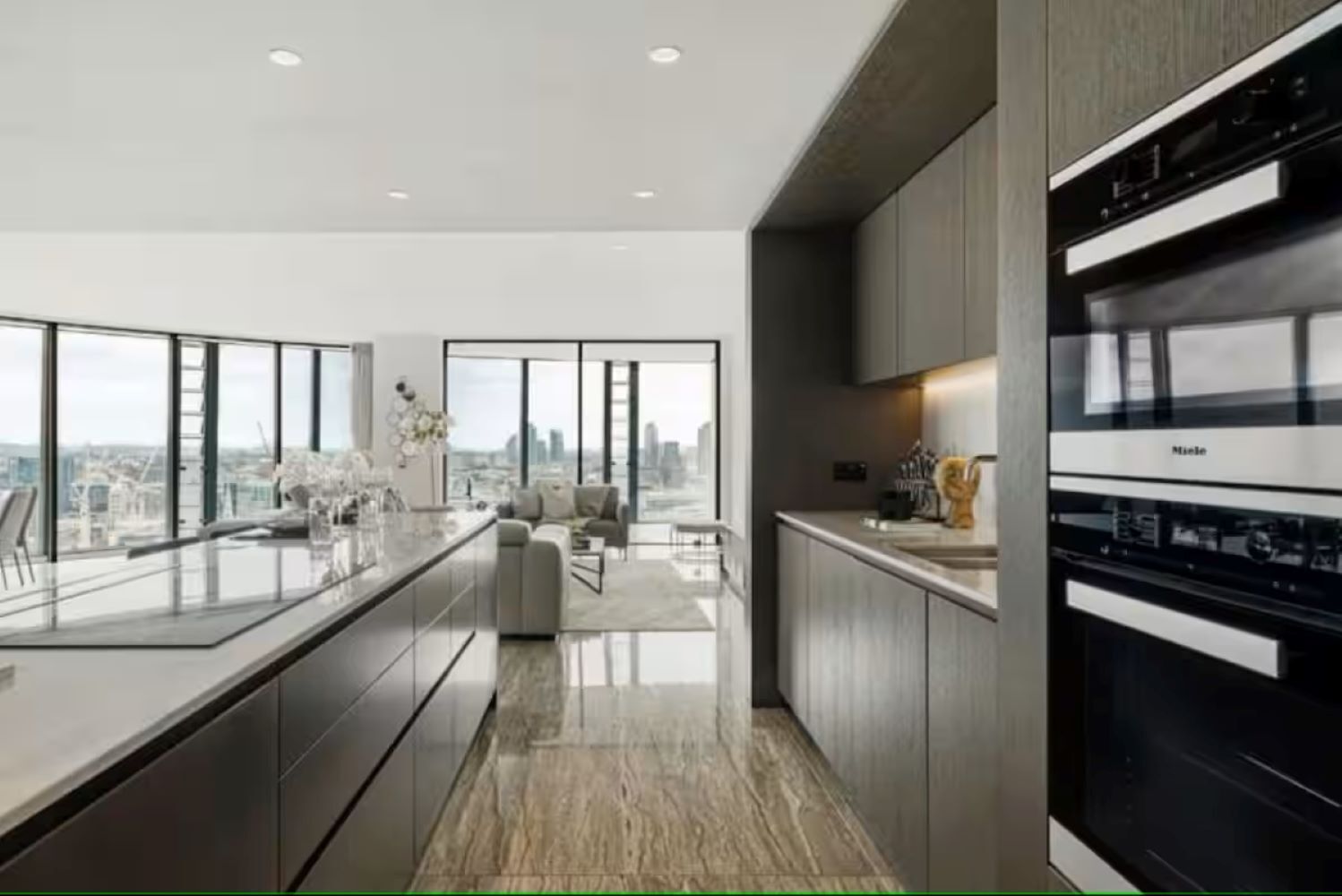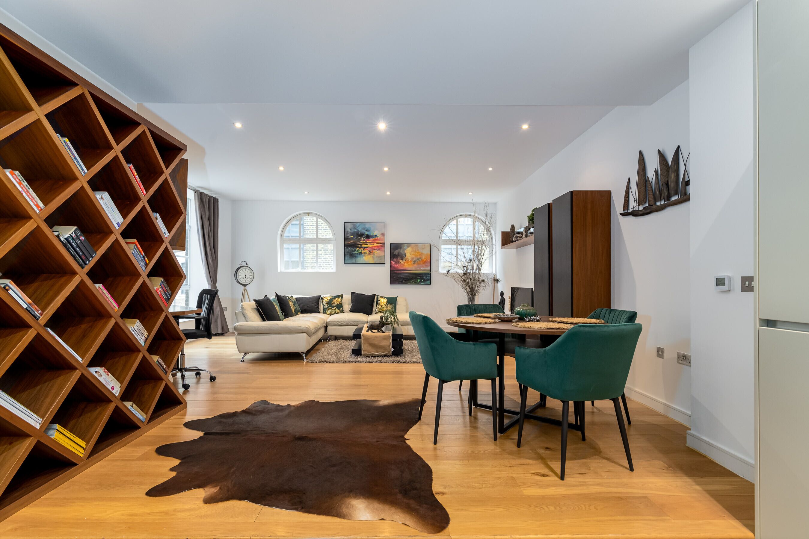 The living area is a lovely place to relax, where two inviting sofas beckon you to unwind in front of the smart TV. Culinary enthusiasts will adore the state-of-the-art kitchen, complete with a sociable breakfast bar and a dining table for four – perfect for savouring home-cooked feasts or takeaways from London's world-class eateries.