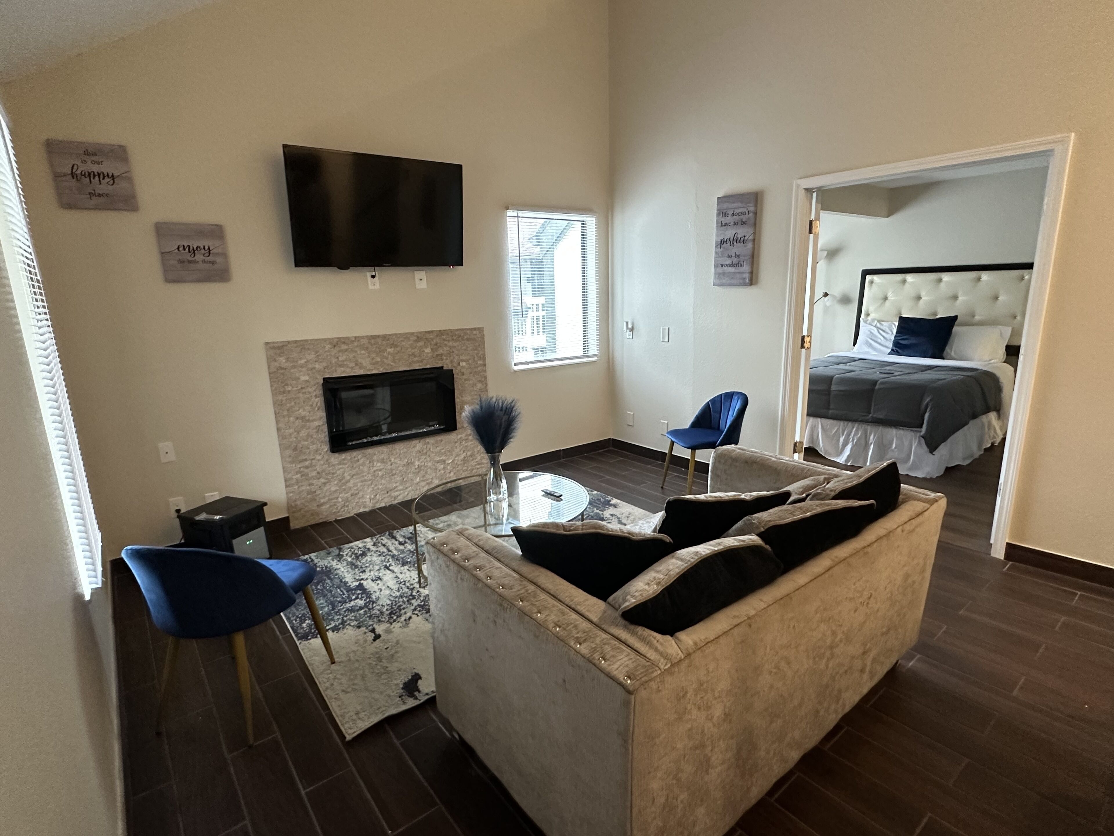Enjoy a stylish experience at this centrally located apartment. Let your senses be immersed in the artfully decorated studio apartment big on style and comfort. Sprawl out in the king-sized bed with luxurious soft linen to embrace you for a wonderful night's sleep. Wake up to your personal coffee shop with a Keurig and an assortment of hot beverages. Enjoy the vibe in front of the fireplace while relaxing in the living space sipping on your favorite beverage or watching your favorite show.